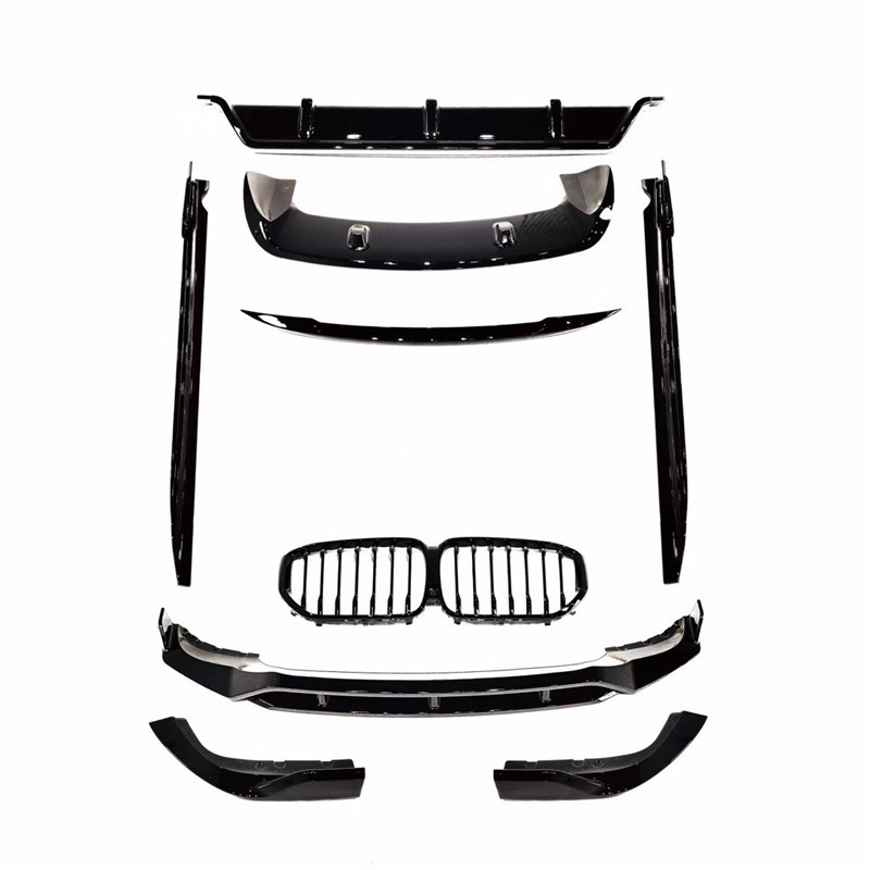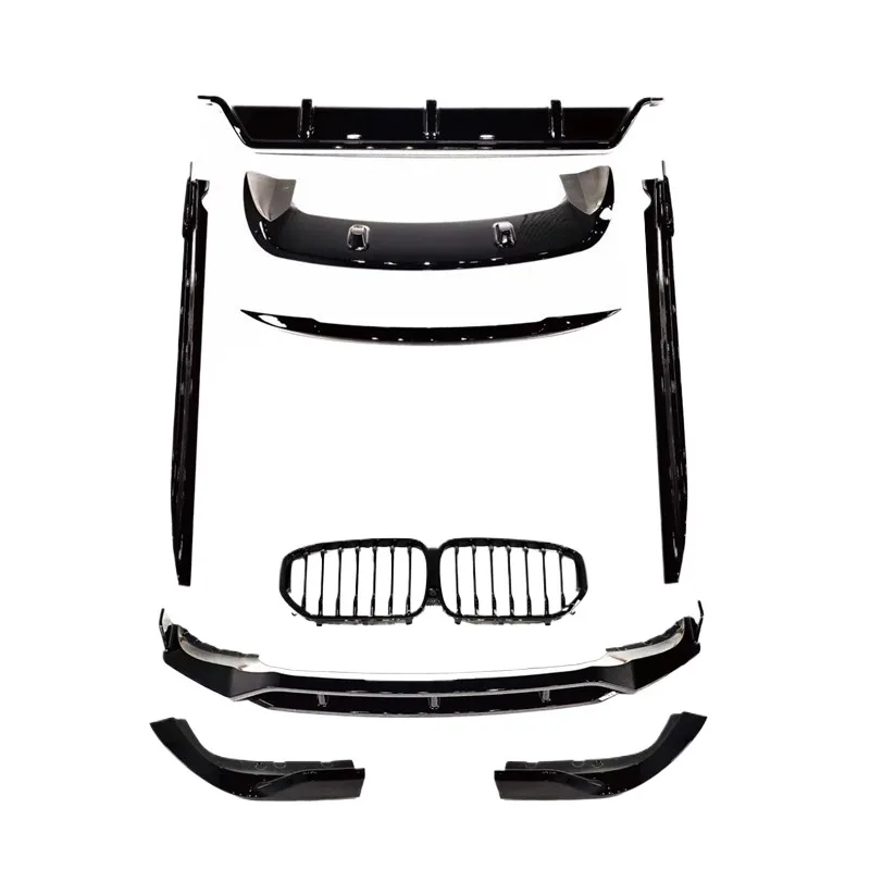 Tags: automotive styling accessories, BMW X5 G05 body kit, exterior modification parts, front kidney grille, gloss black car tuning, rear spoiler wing, side skirt extensions