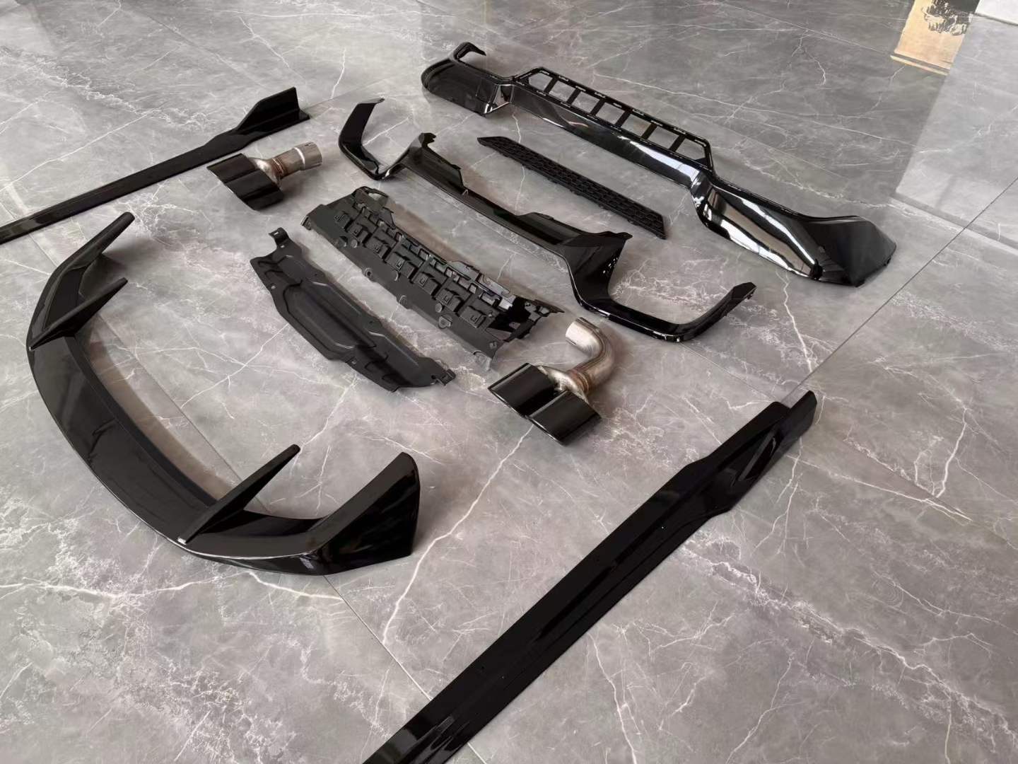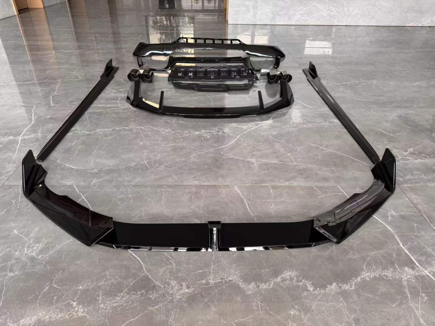 - Comprehensive exterior upgrade featuring a front lip, rear diffuser, exhaust tips, roof spoiler, and side skirts for a complete visual transformation.