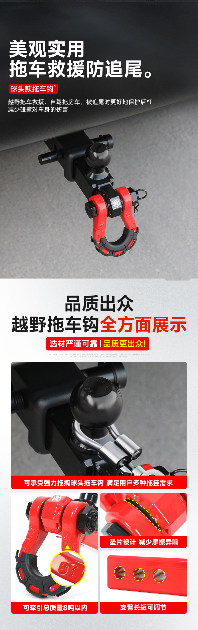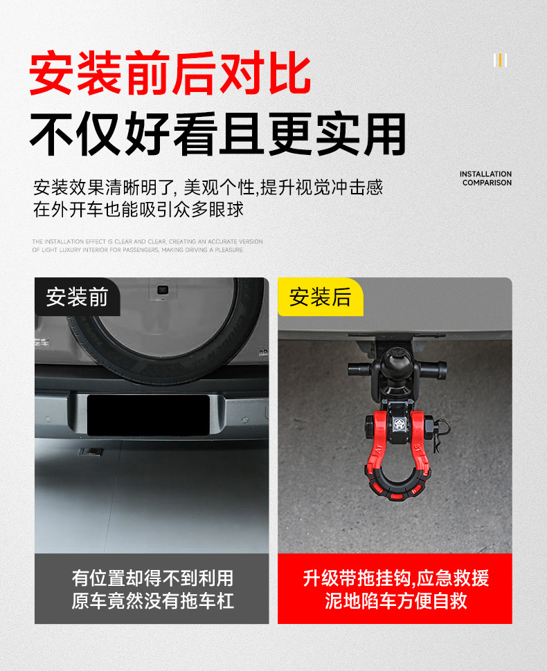 - Features a reinforced U-shaped tow hook design for enhanced safety during recovery operations and improved rear-end anti-collision protection.