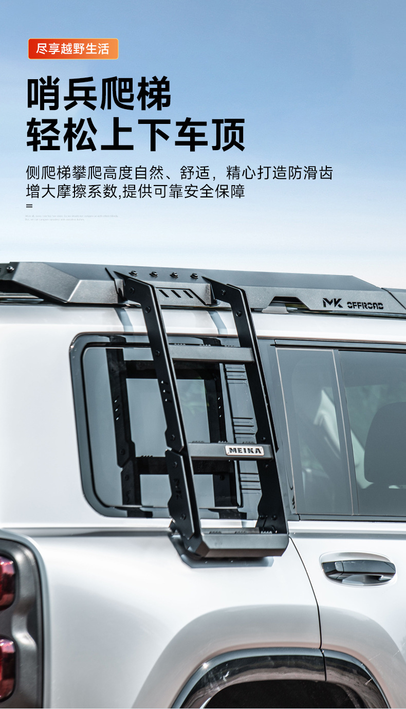 - Integrated side ladder and extension platform provide stable access and expanded storage capacity for heavy outdoor gear.