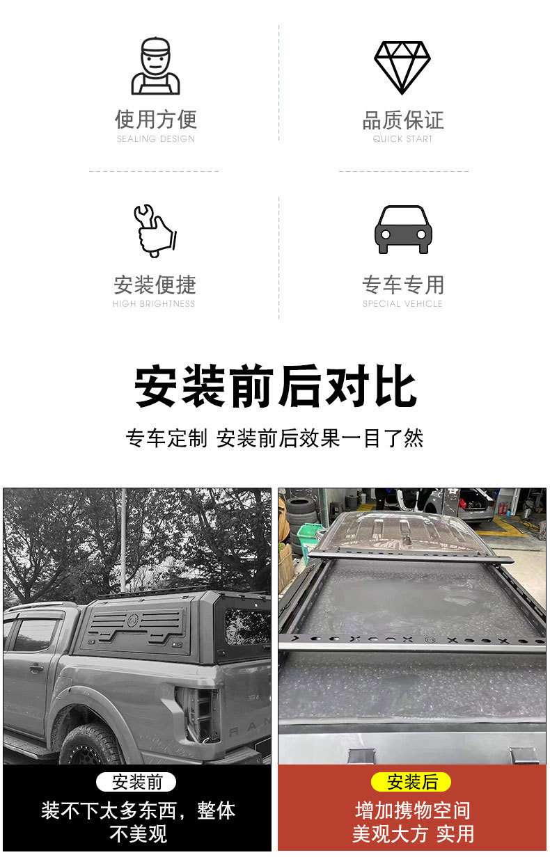 - Versatile design specifically engineered for pickup trucks with canopy or tri-fold hard covers to increase cargo capacity.
