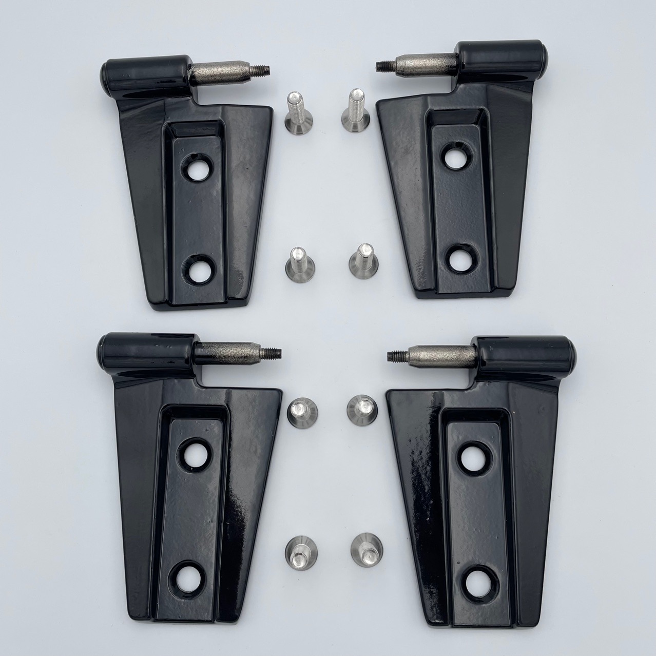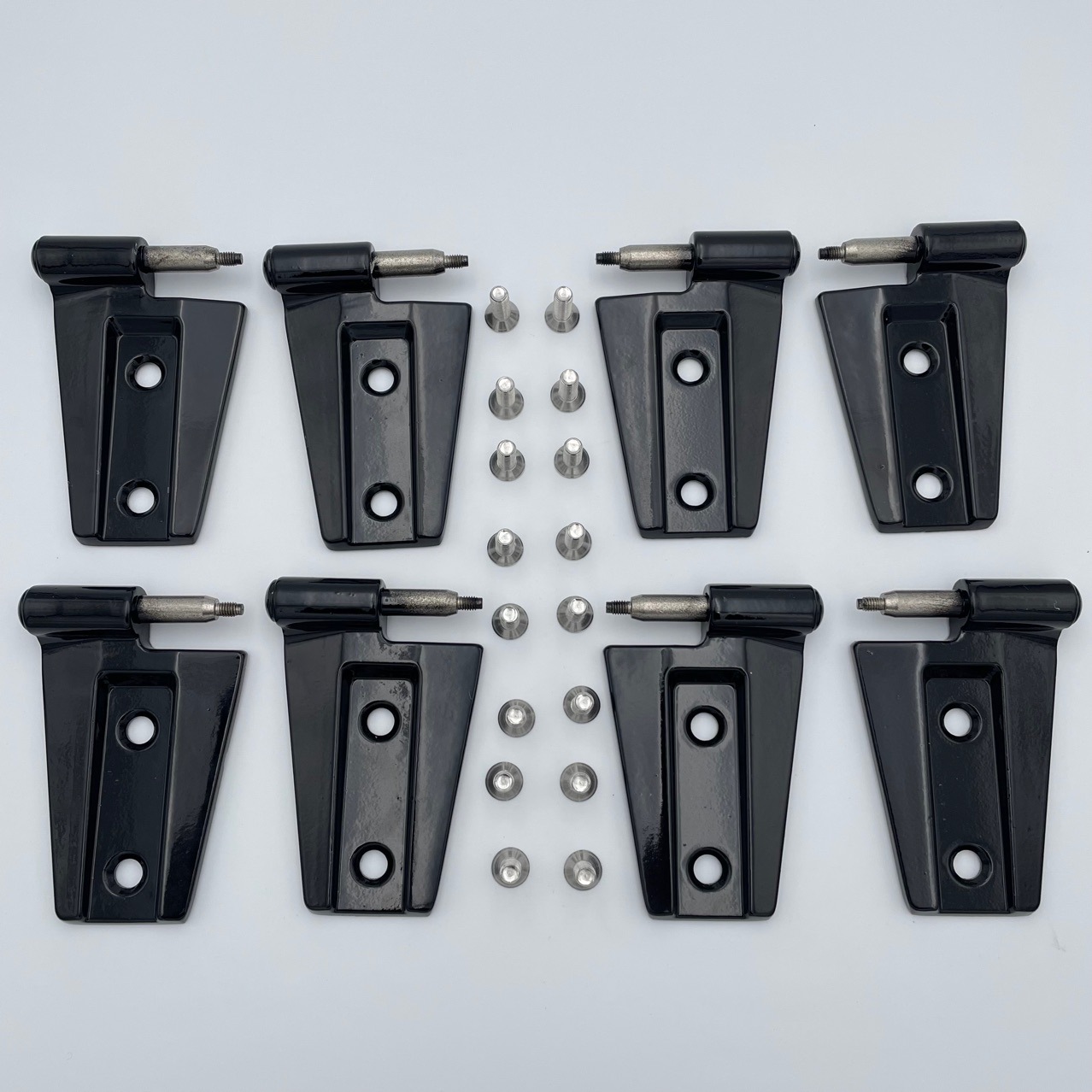 Upgrade your Jeep Wrangler JK with our rust-proof 8-piece aluminum door hinge set. Durable black powder coat finish, direct bolt-on fit for 2007-2017 4-door models.