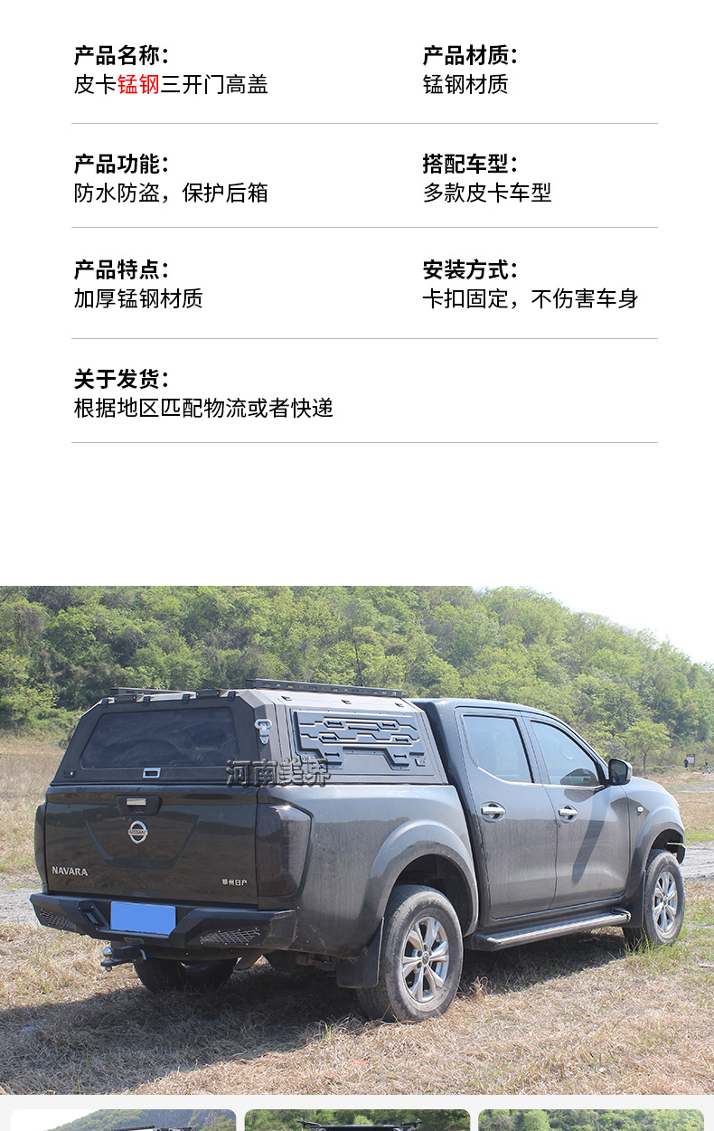 Upgrade your Nissan Navara D23 or Ruiqi 6 with this heavy-duty manganese steel truck bed canopy. Featuring a triple-door design for easy access and superior security.