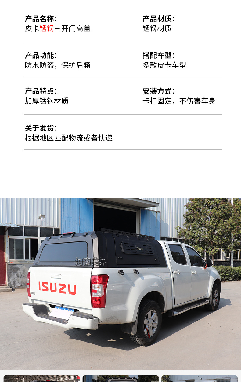 Upgrade your Isuzu D-MAX with our rugged manganese steel truck bed hutch cover. Features triple opening doors for easy access and superior cargo protection.