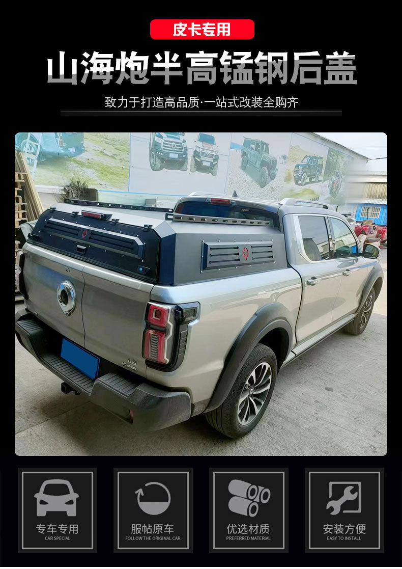 Tags: camping truck shell, GWM Cannon accessories, manganese steel roof top, off-road truck modifications, pickup bed cover, rear cargo cap, truck bed canopy