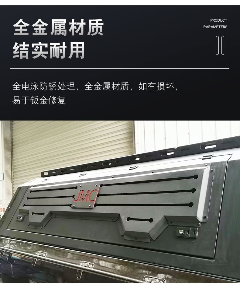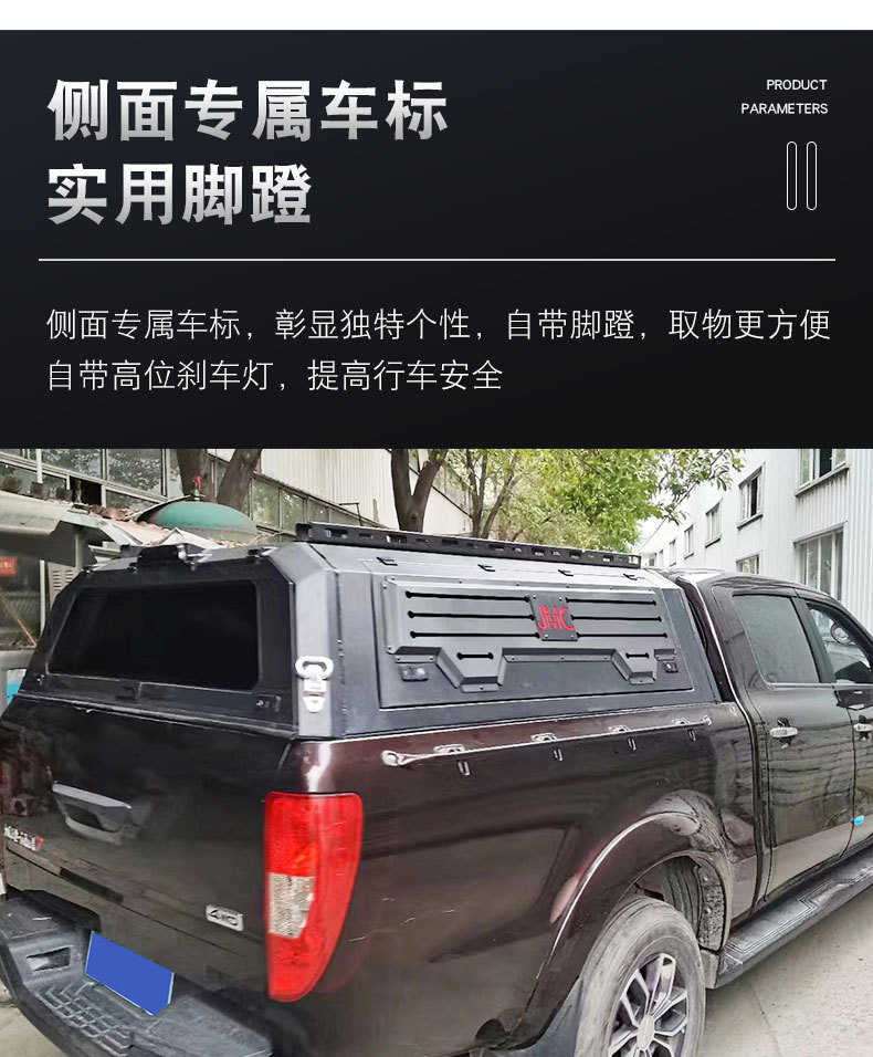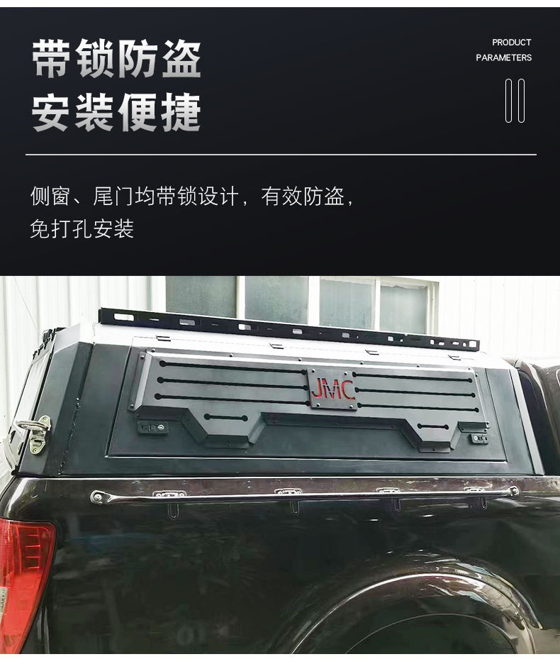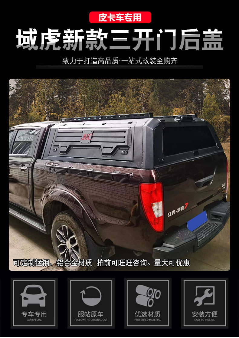 Enhance your JMC Vigus 3/5/7 with this heavy duty manganese steel pickup bed canopy featuring a triple-opening door design for maximum utility and cargo protection.