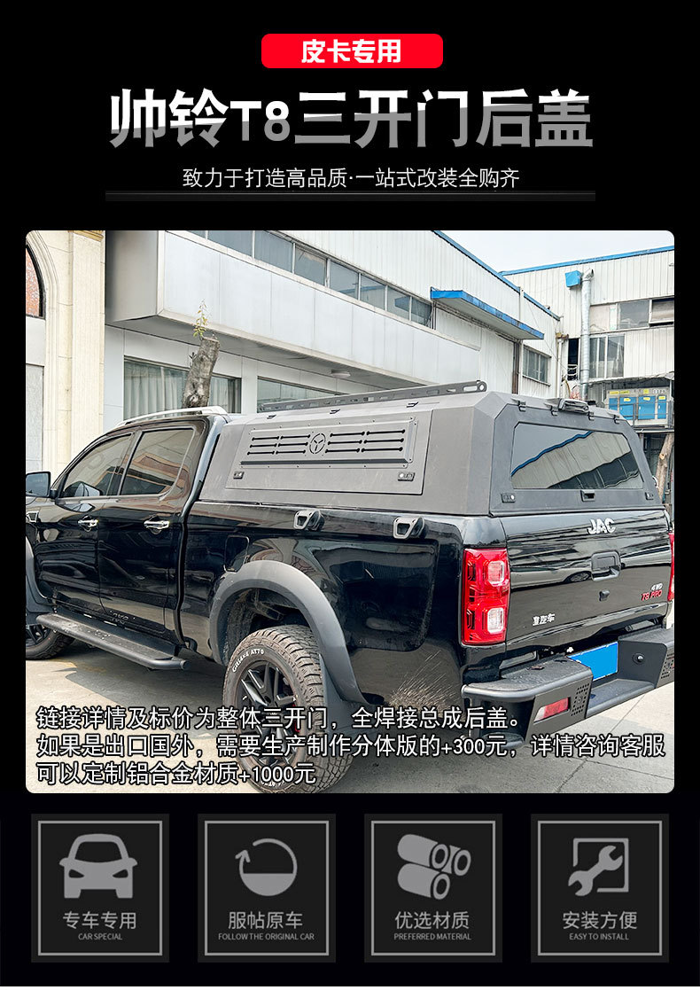 Upgrade your JAC T8 or T6 with this premium manganese steel truck bed canopy. Featuring a 3-door design for easy access and maximum cargo protection and space.
