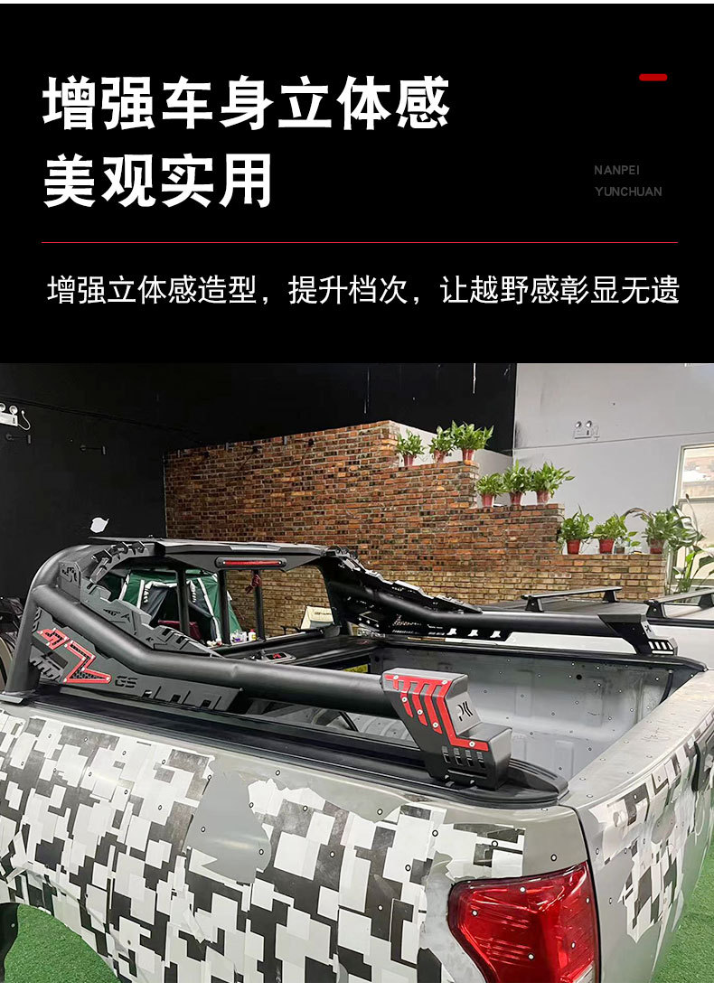 - Integrated roll bar design provides enhanced protection and a rugged aesthetic for midsize and full-size pickup truck beds.