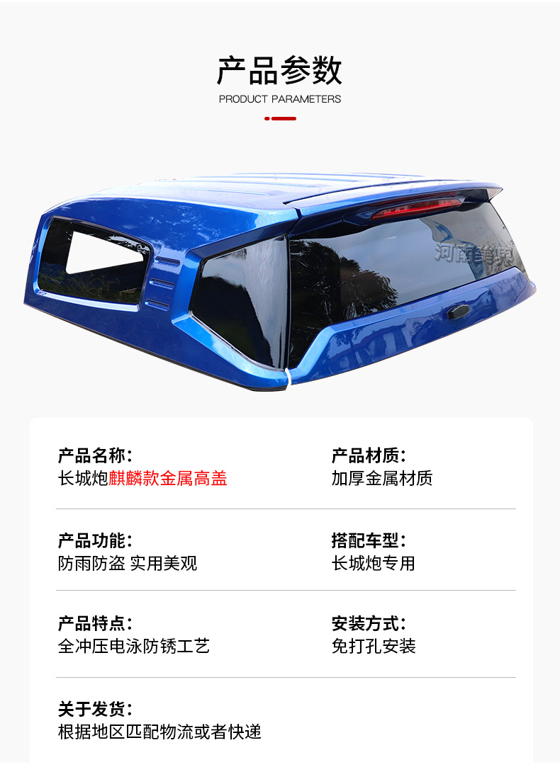Upgrade your GWM Cannon with this Kirin Edition metal stamped high roof canopy. Durable steel construction provides maximum protection and expanded truck bed storage.