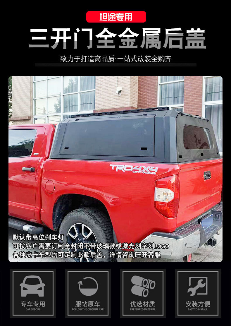 Upgrade your Toyota Tundra with our durable three-door steel truck bed canopy. Features secure access from three sides and heavy-duty cargo protection. Shop now.