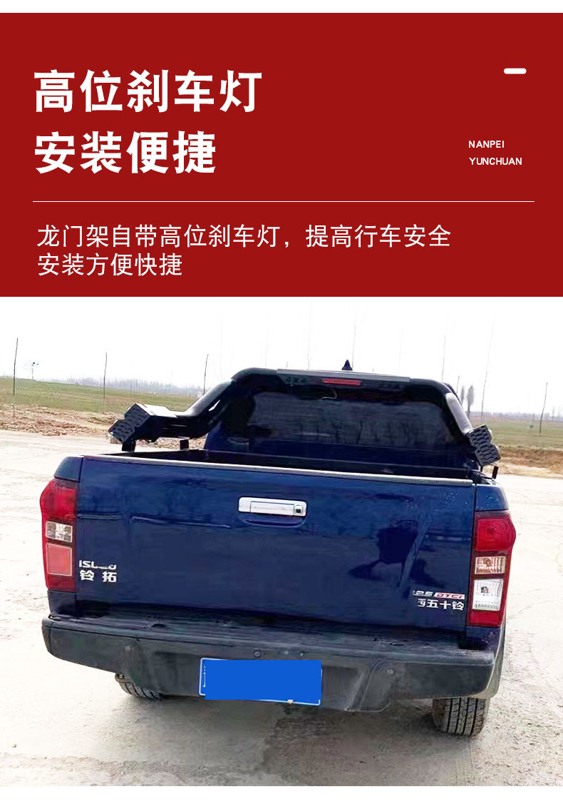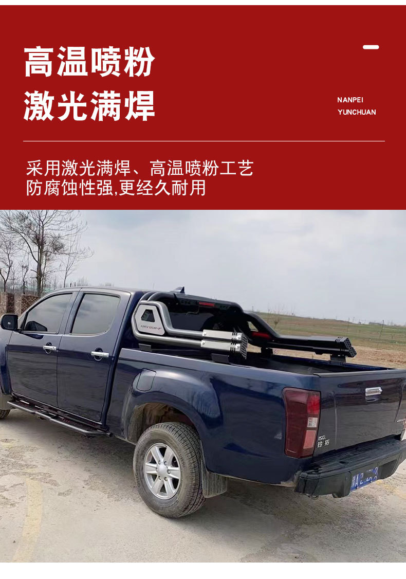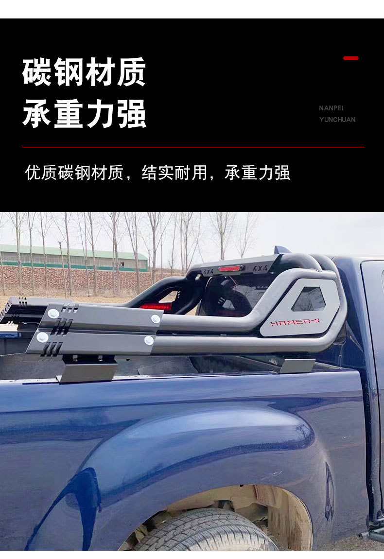 - Integrated roll bar design provides enhanced structural protection for the truck bed area during transport.