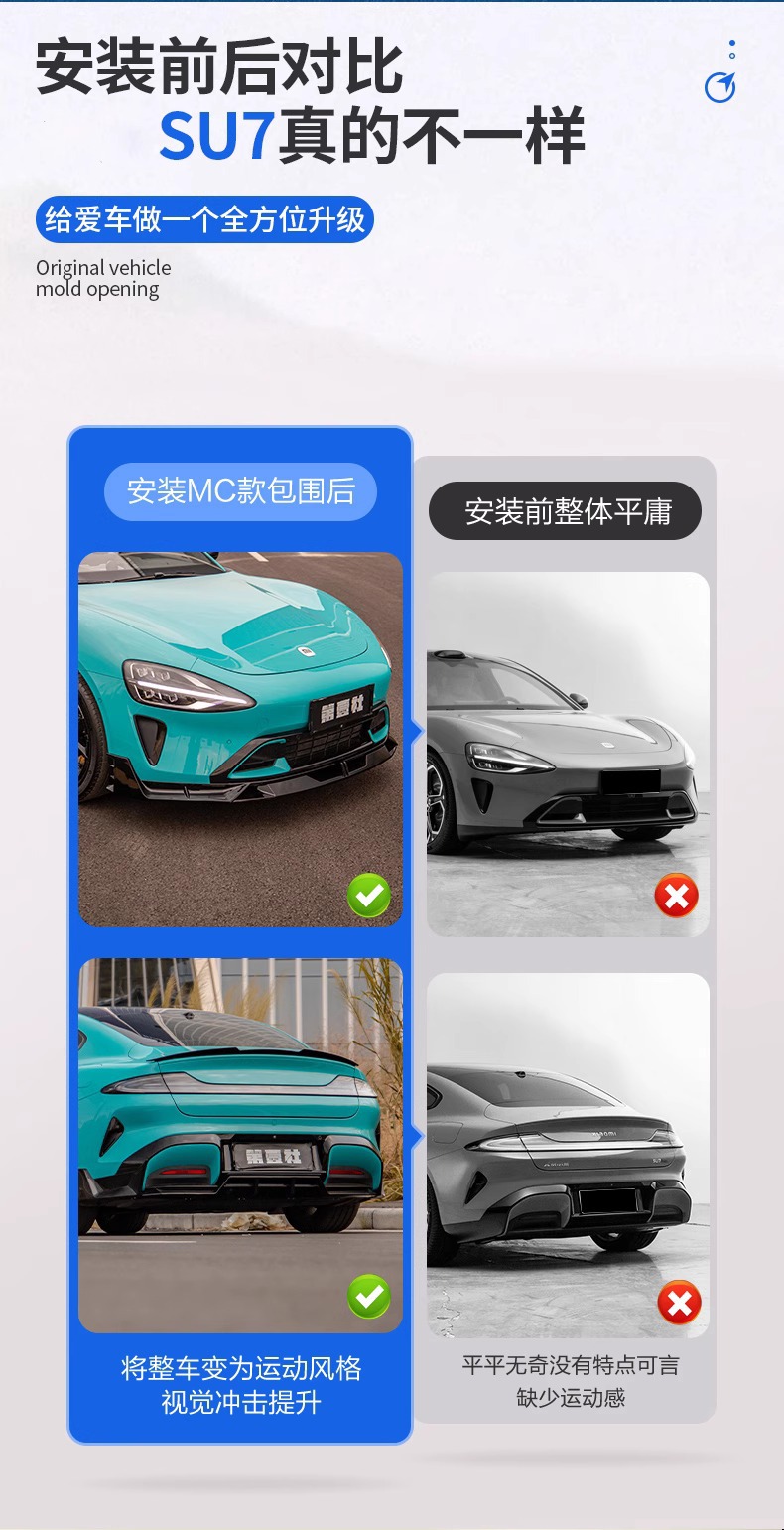 Be the first to review “Injection Molded Exterior Body Kit Accessories Integrated Front Lip Splitter Side Skirts and Rear Diffuser Spoiler Compatible with Xiaomi SU7” Cancel reply