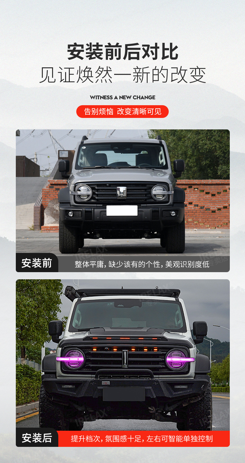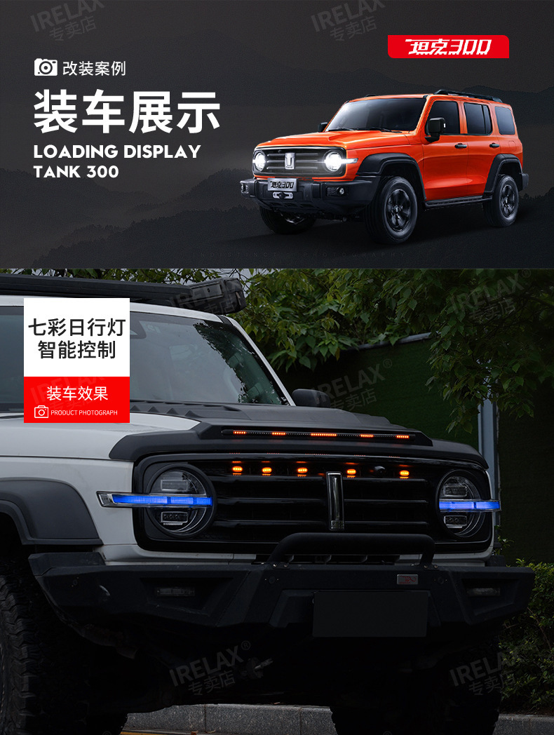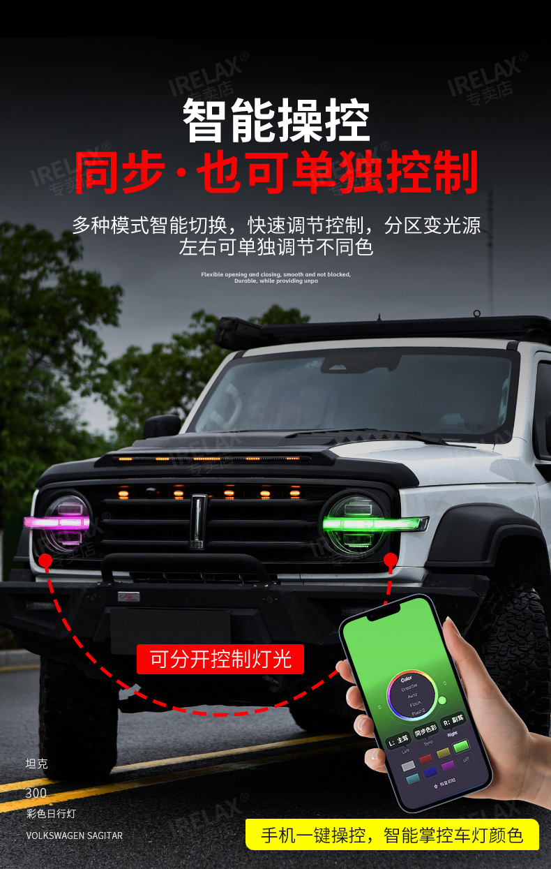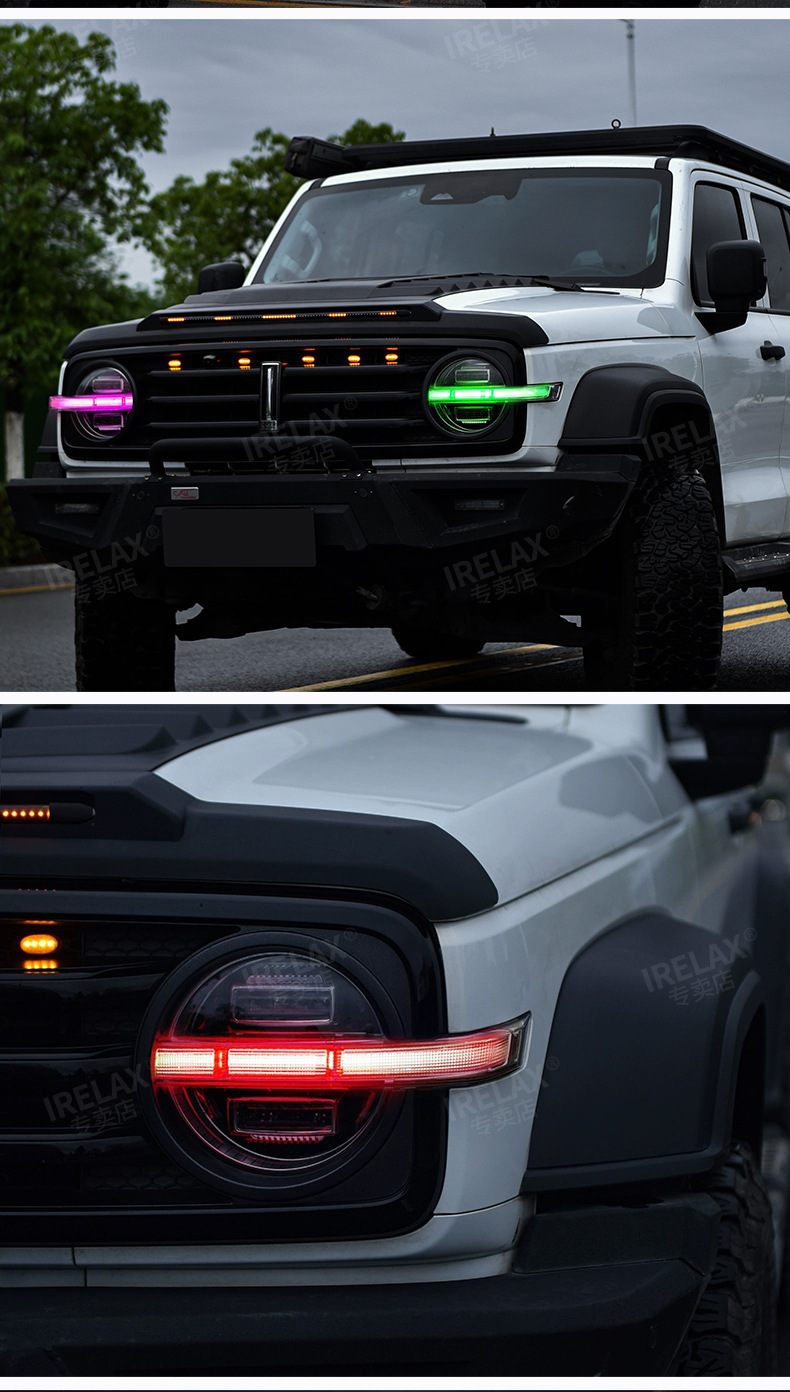 Upgrade your TANK 300 with 64-color LED daytime running lights. Features smartphone APP control and red demon eye mode for a customized, high-tech appearance.