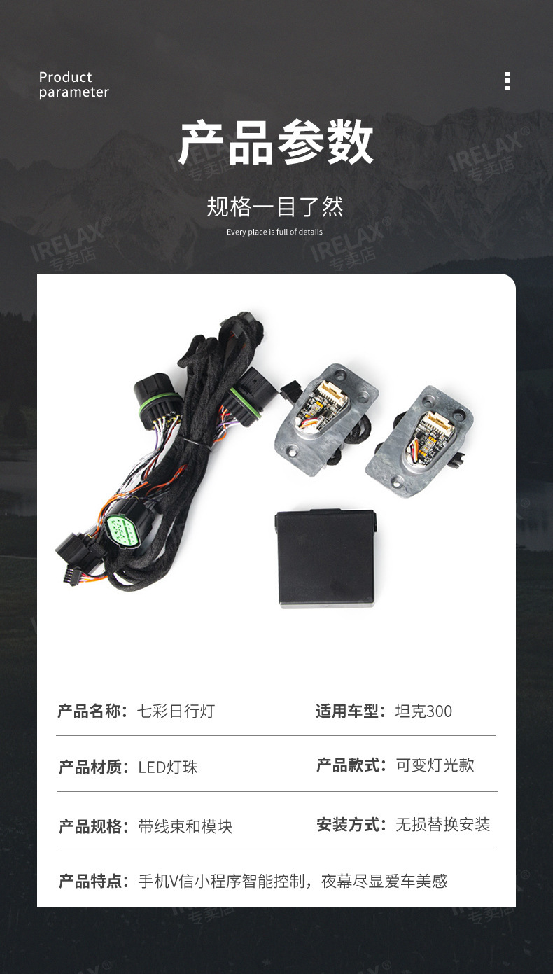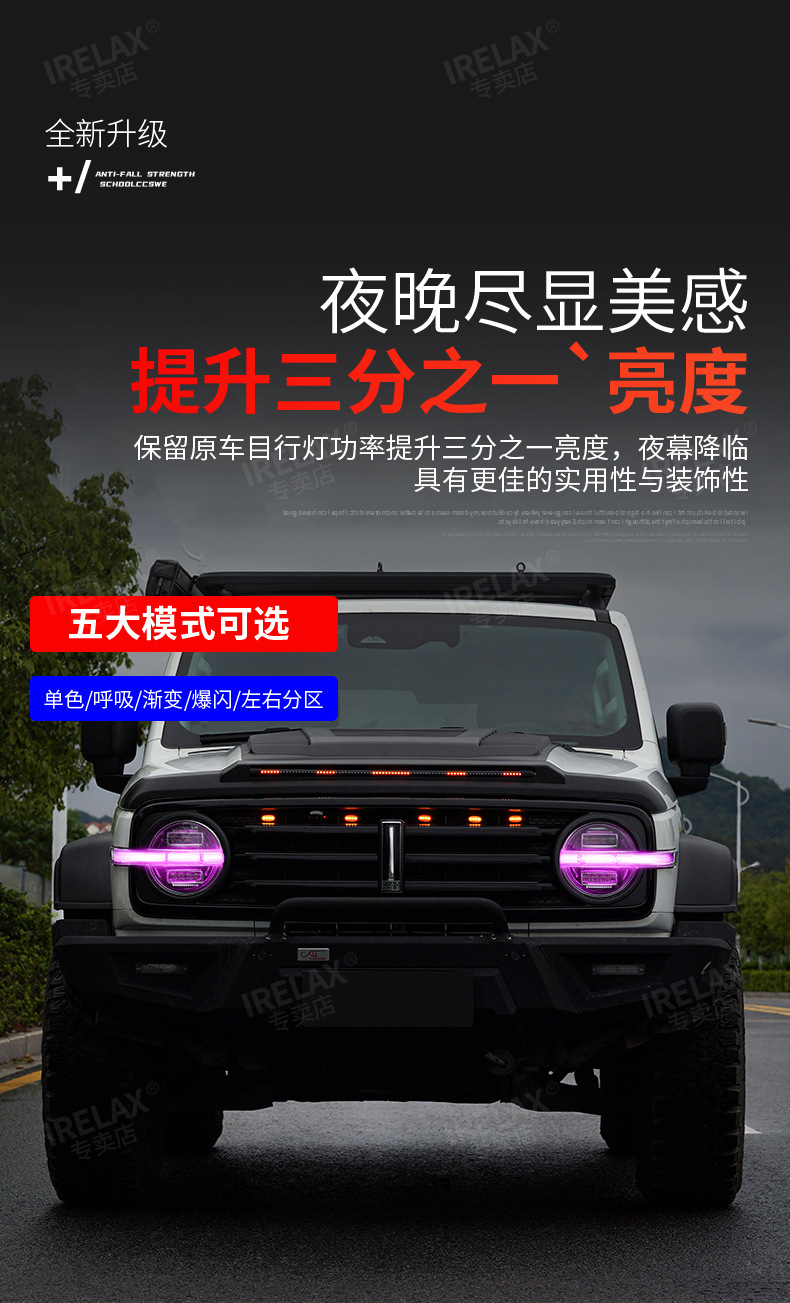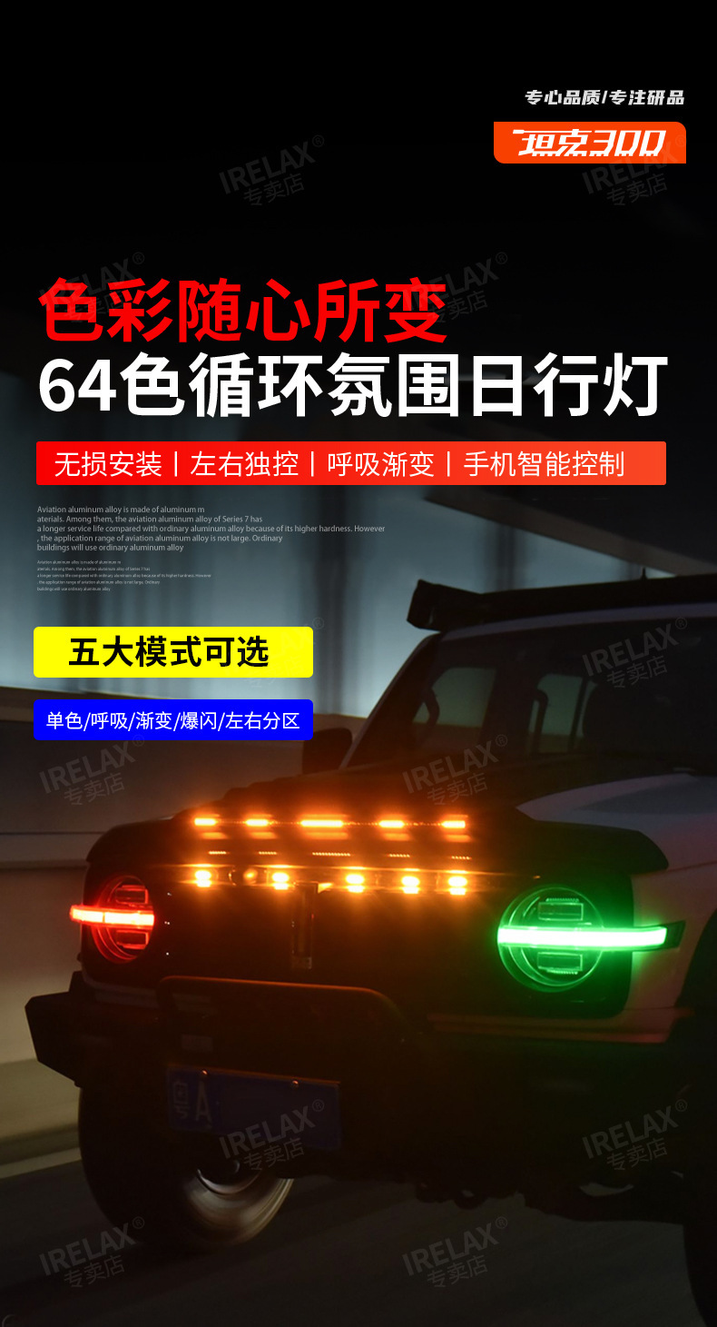 Upgrade your TANK 300 with 64-color LED daytime running lights. Features smartphone APP control and red demon eye mode for a customized, high-tech appearance.
