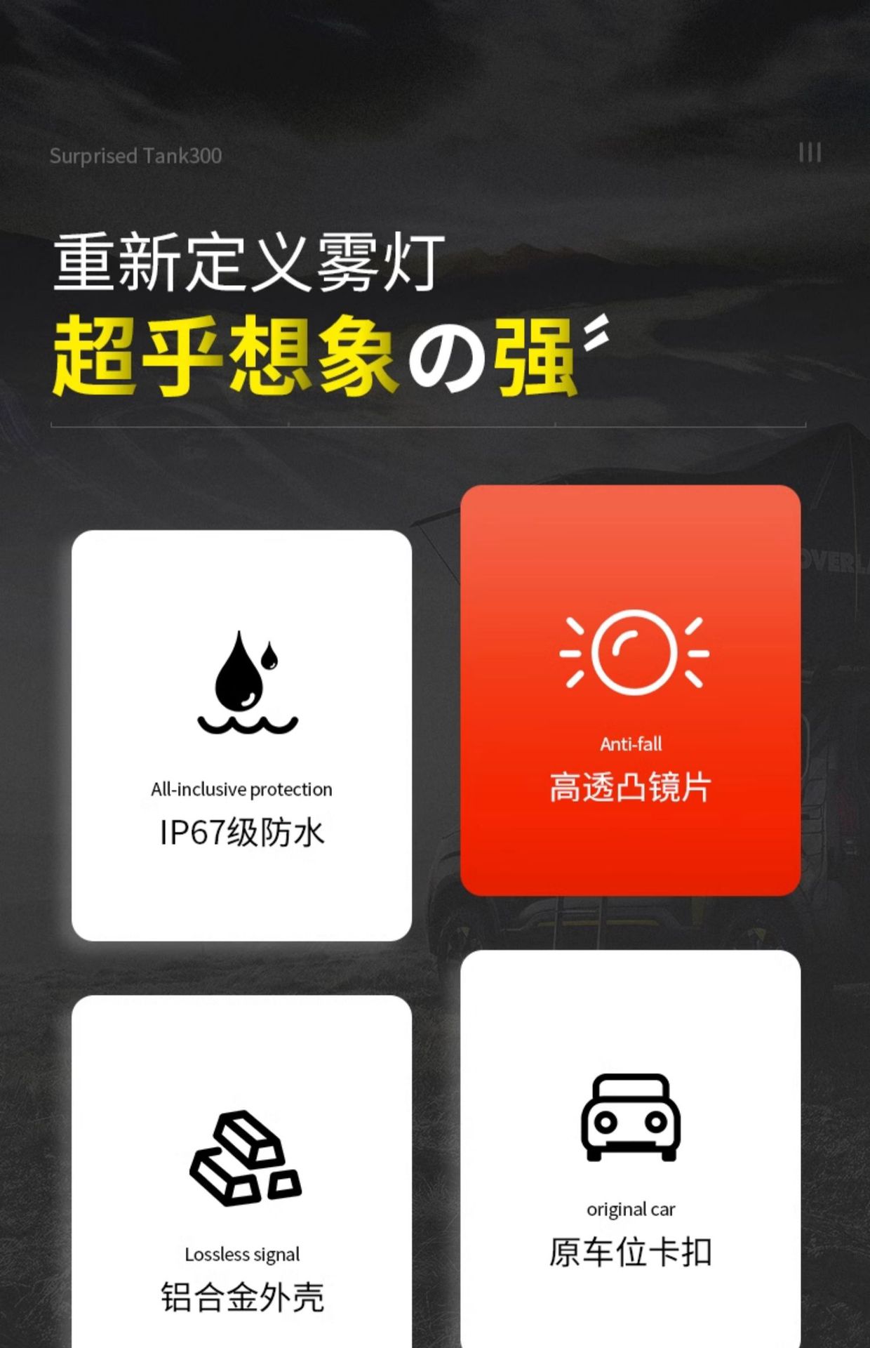 Be the first to review “LED Fog Light Assembly with Dual Lens and Sequential Turn Signal for Tank 300 Grille Accent Lighting” Cancel reply