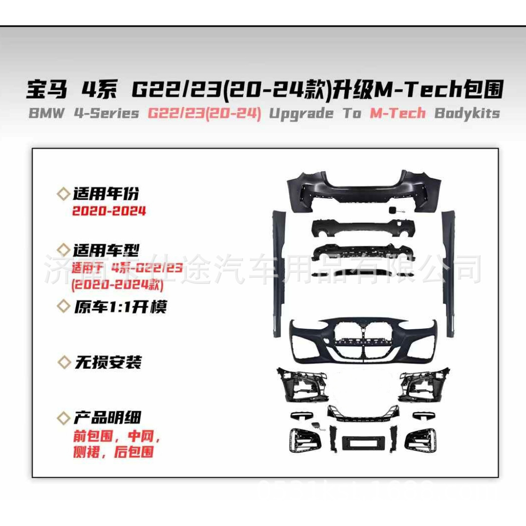 - Comprehensive M-Tech style conversion kit specifically designed for BMW 4 Series G22 2-door models to enhance sporty aesthetics.