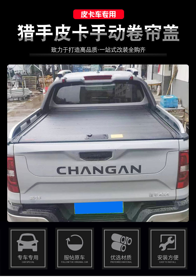 Upgrade your Changan Hunter with this C-style manual retractable tonneau cover. Features a power combination lock and installs without removing the factory roll bar.