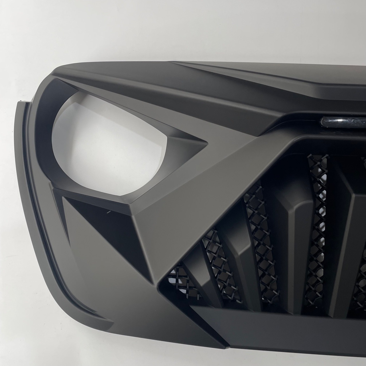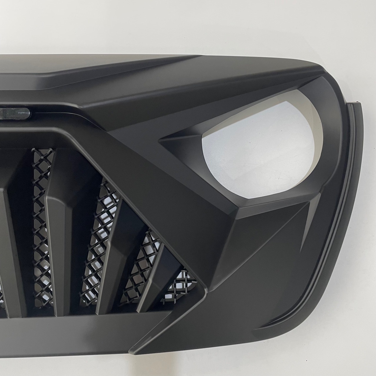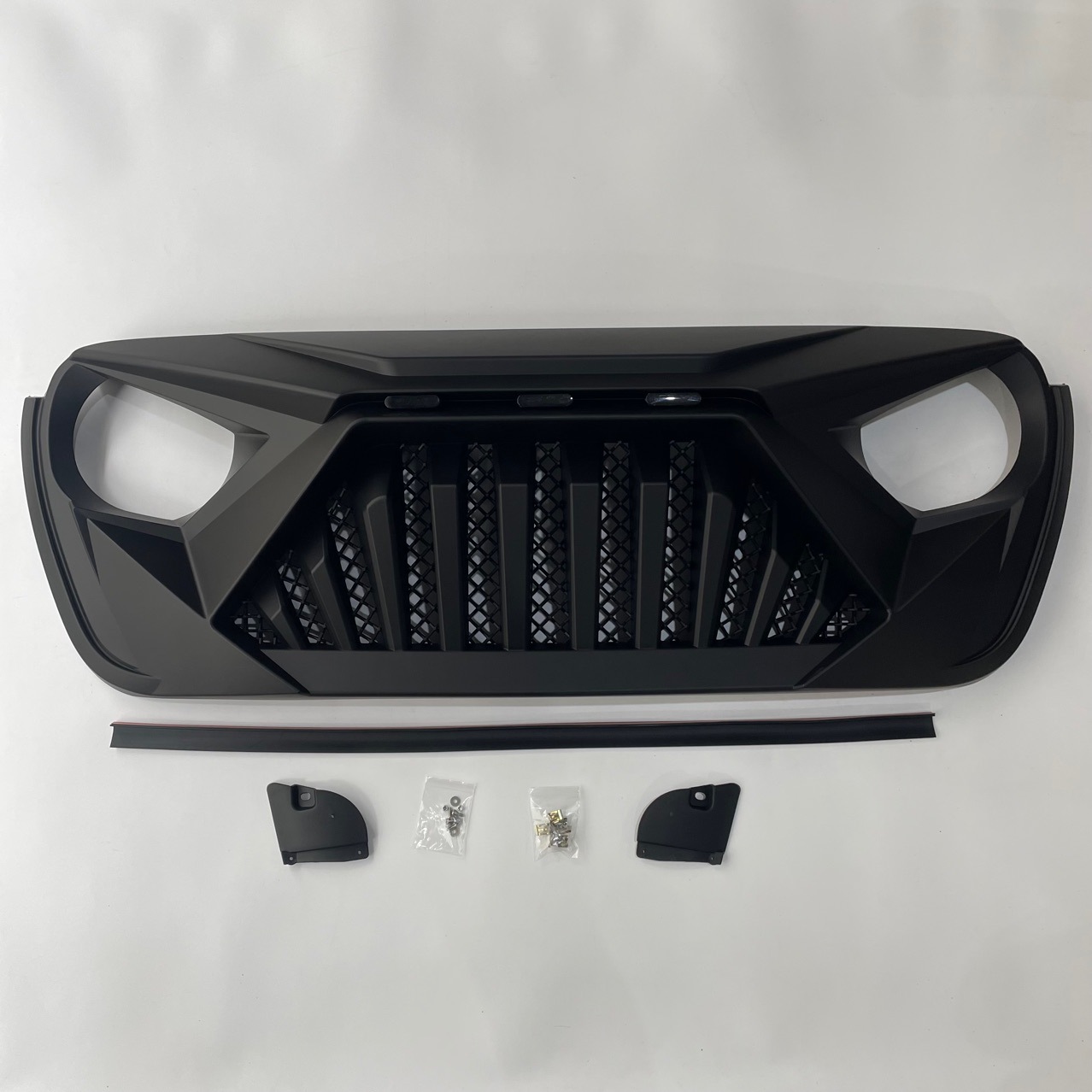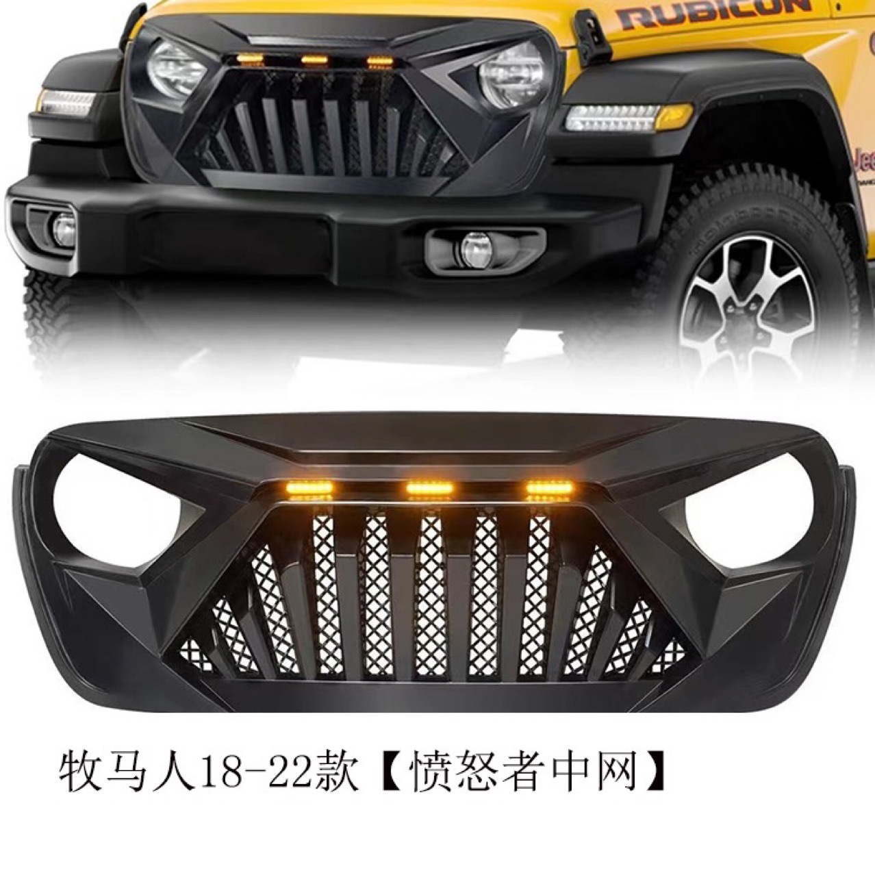 Transform your 2018-2024 Jeep Wrangler JL or Gladiator JT with our Matte Black Angry Eye Front Grille featuring 3 amber LED lights. Durable ABS, easy installation.
