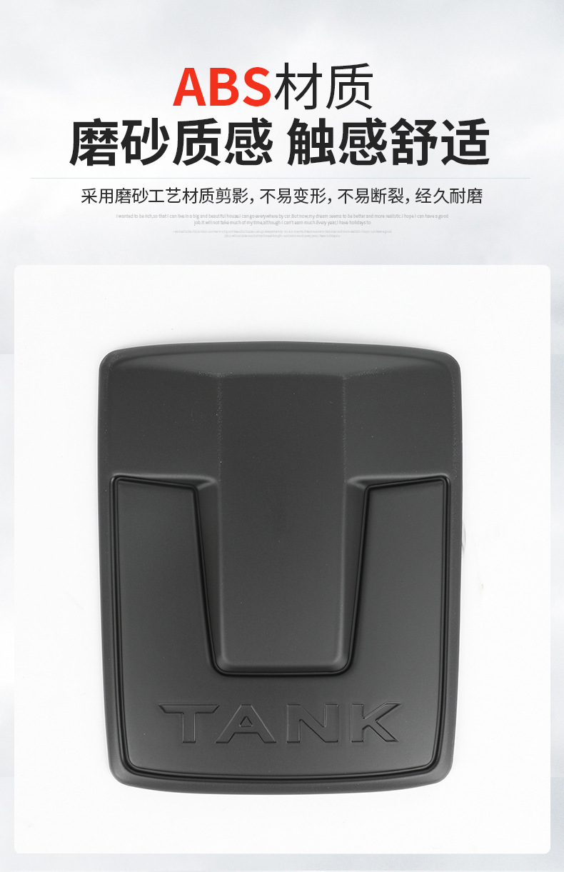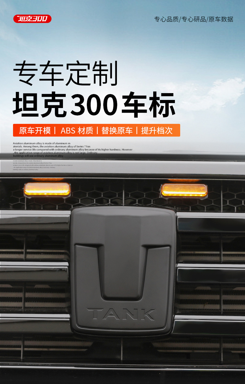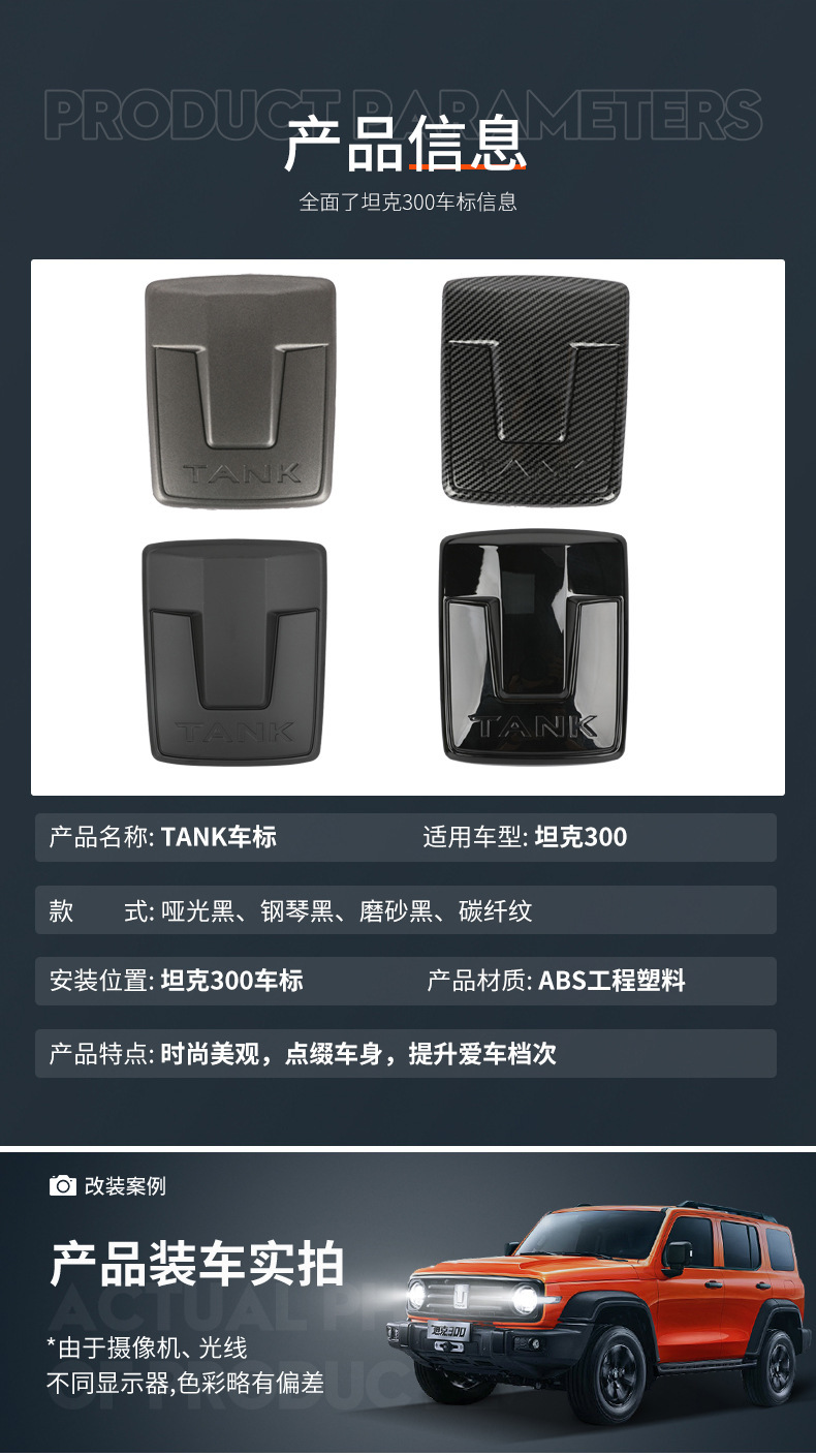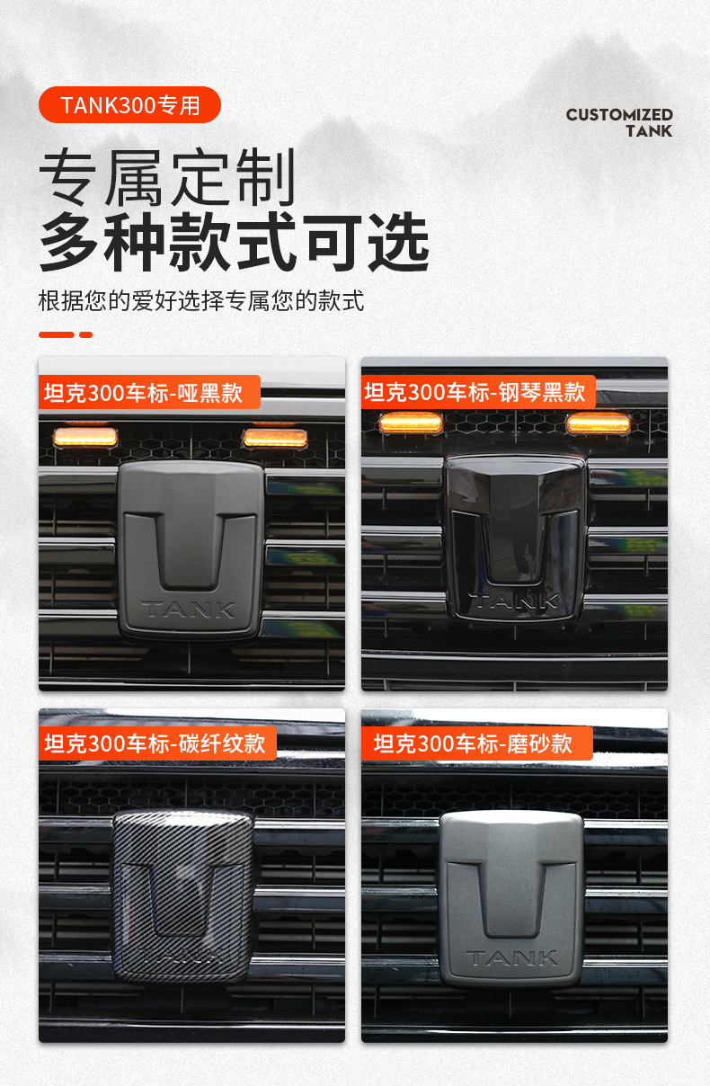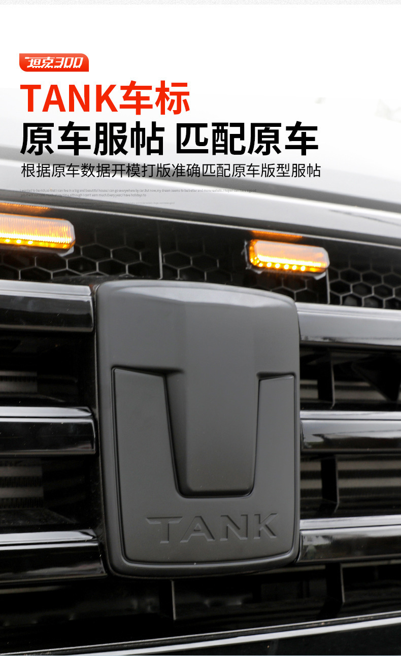 Upgrade your vehicle with this matte black emblem kit for Tank 300. Includes grille and wheel hub decals made of durable ABS for a sleek, custom cyber-style look.