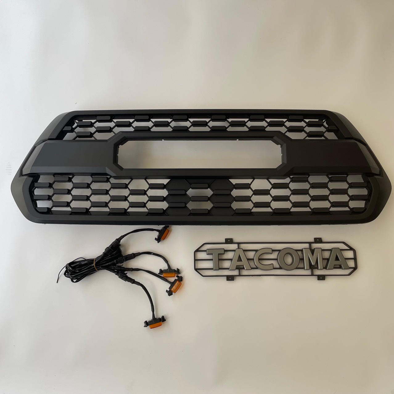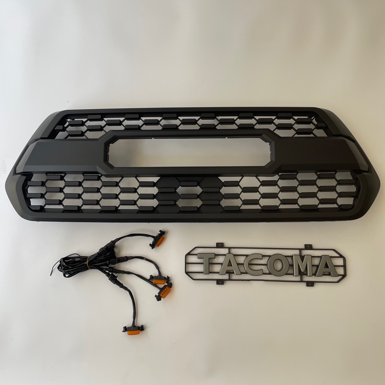 Upgrade your 2016-2018 Toyota Tacoma with this matte black TRD Pro-style front grille featuring 3 amber LED marker lights and a bold TACOMA emblem. Easy bolt-on install.