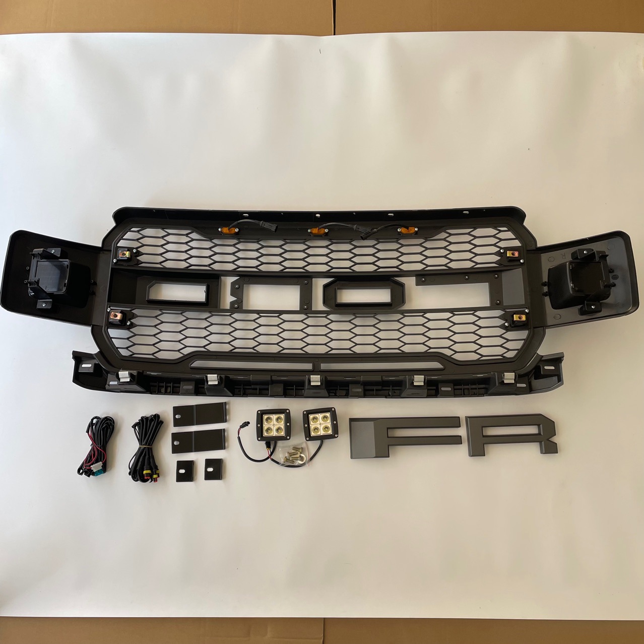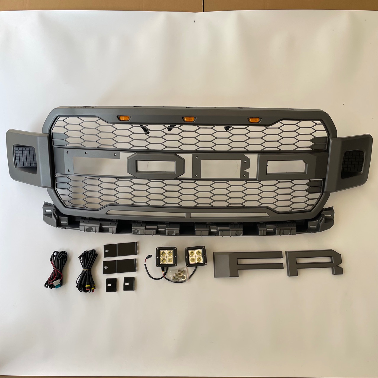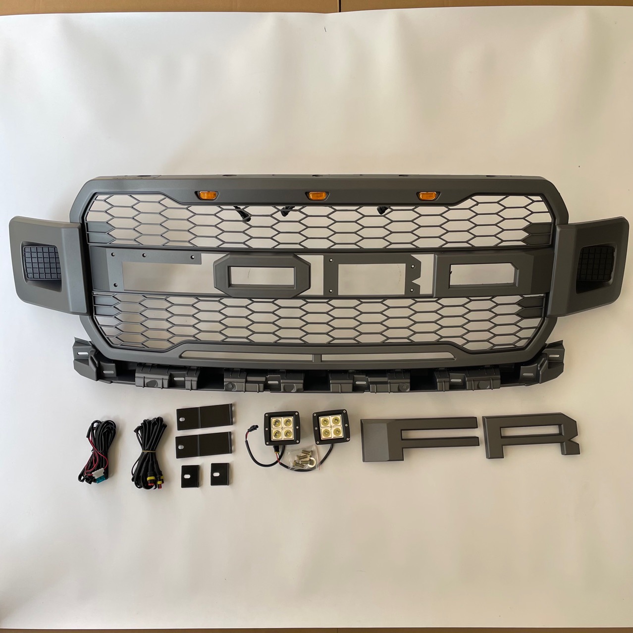 Transform your 2018-2020 Ford F150 with this aggressive Raptor-style honeycomb grille. Includes built-in amber LEDs and spotlights for ultimate style and visibility.