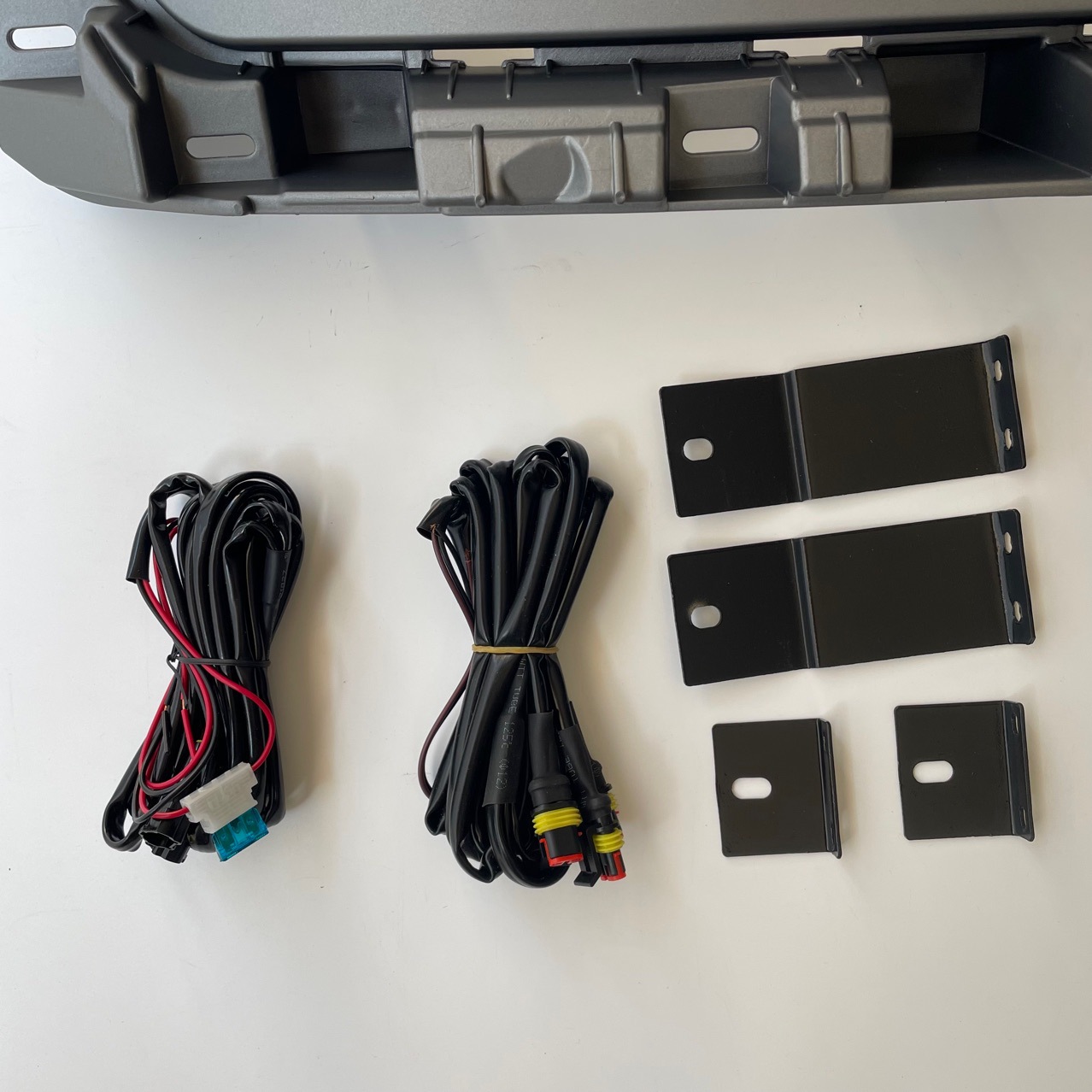 A: A full wiring harness for the amber LED marker lights and the spotlights is included in the package, ensuring a clean and functional electrical connection.