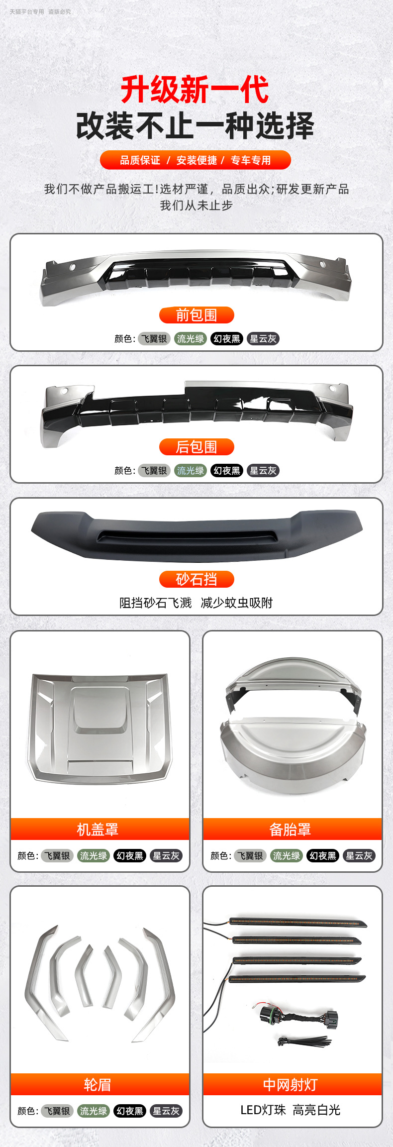 - Comprehensive mecha-style exterior upgrade including front and rear bumper components and a matching spare tire cover for a rugged aesthetic.