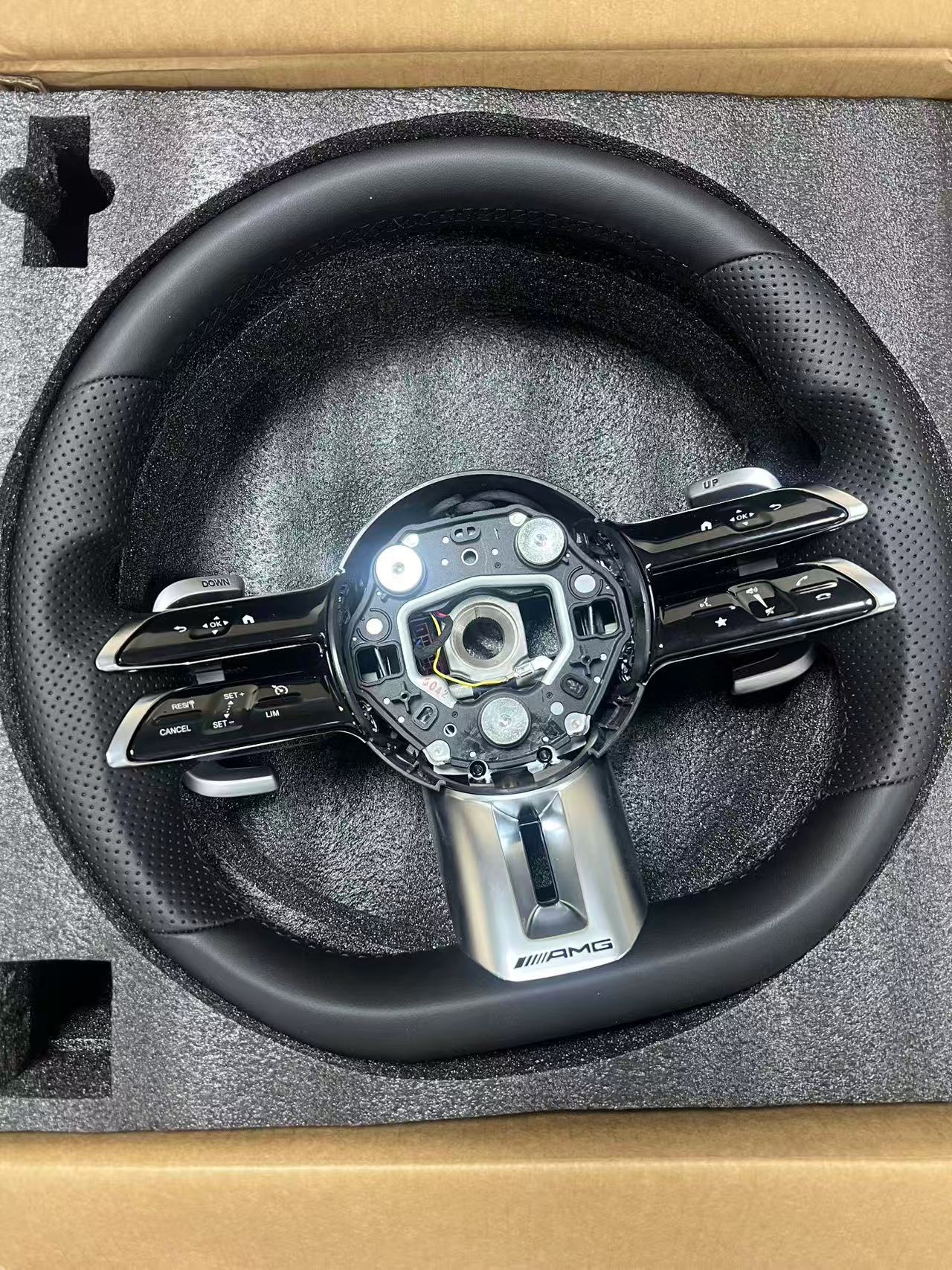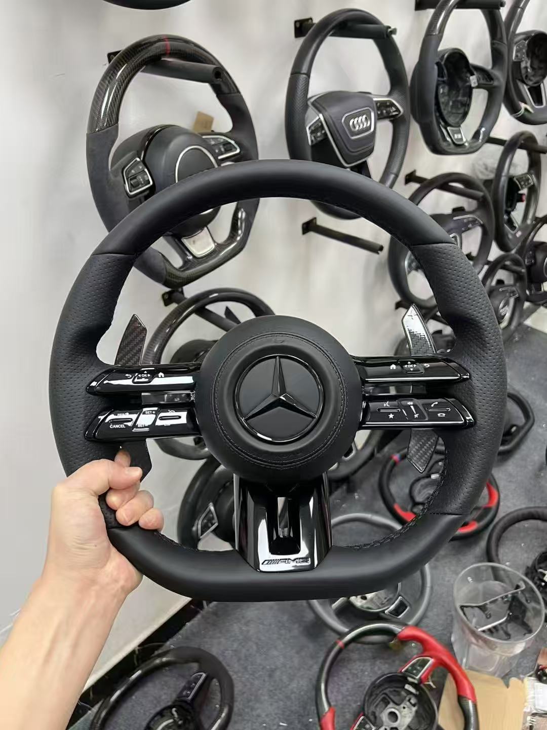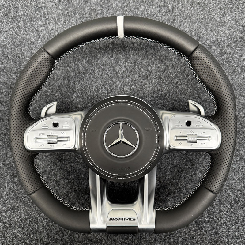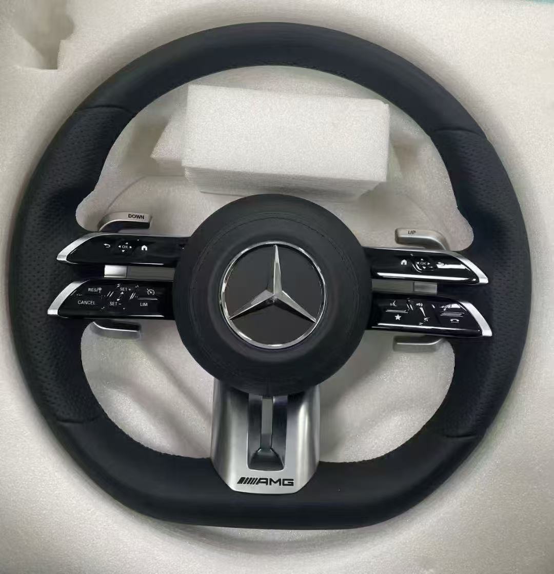 Upgrade your Mercedes with this premium leather AMG Dragonfly style steering wheel assembly. Features ergonomic grip, luxury materials, and a sporty aesthetic.