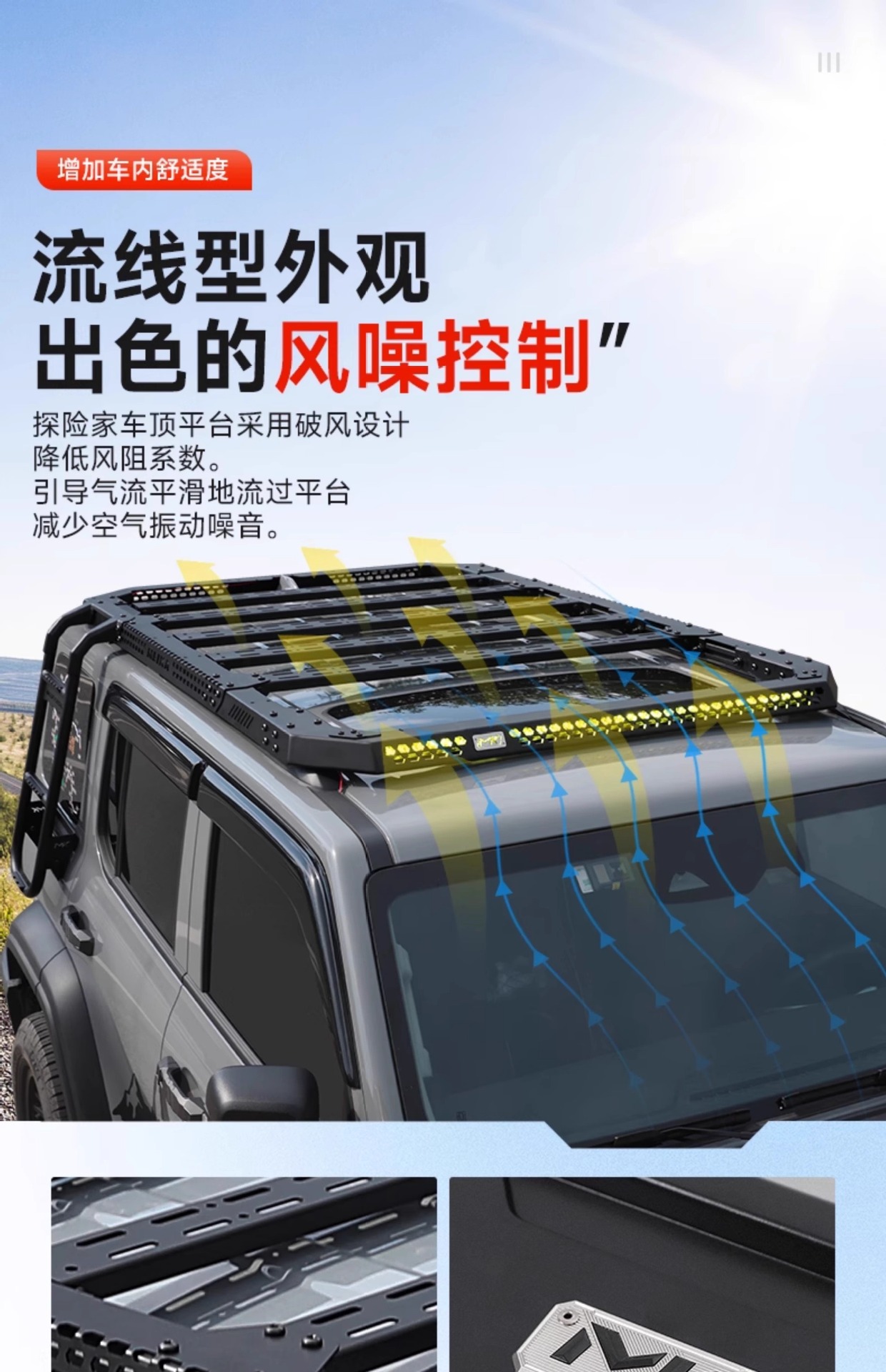 - Custom fit low-profile embedded design specifically engineered for Tank 300 roof contours to minimize wind resistance.