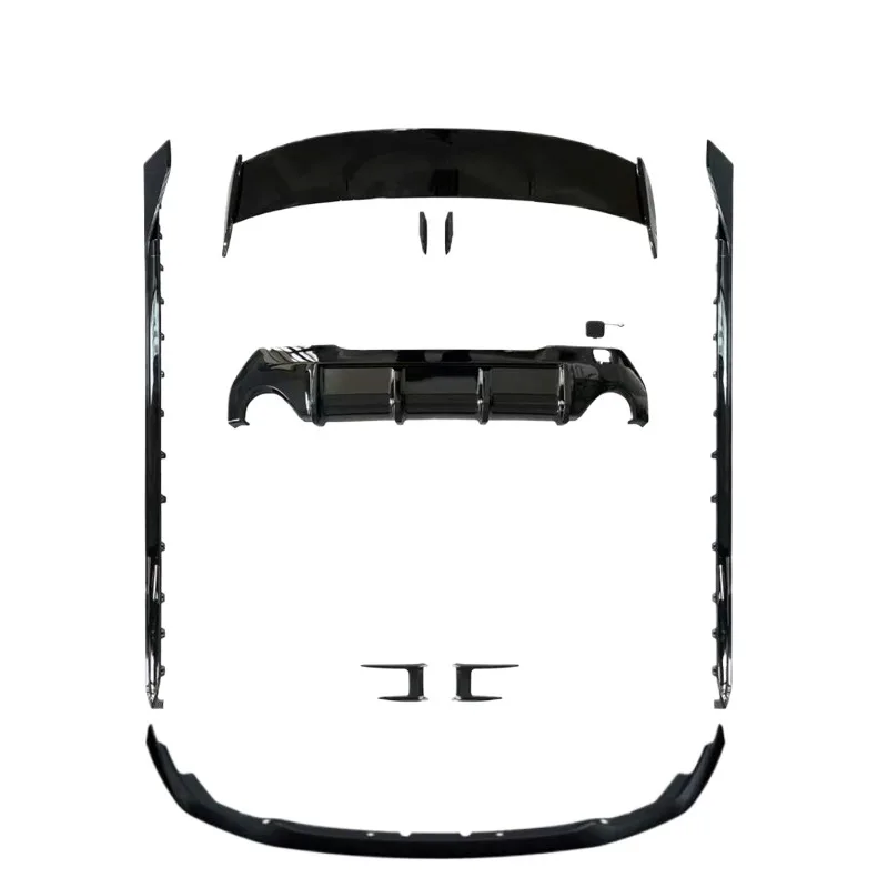- Complete exterior component set including front lip spoiler, side skirt extensions, and rear lower diffuser.