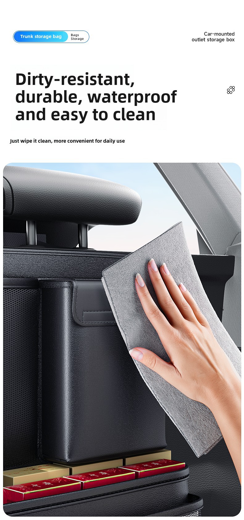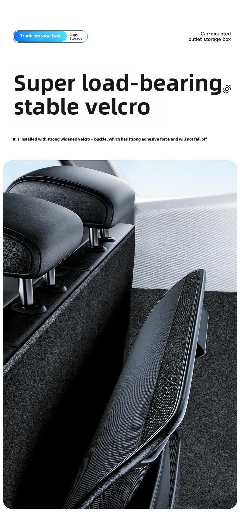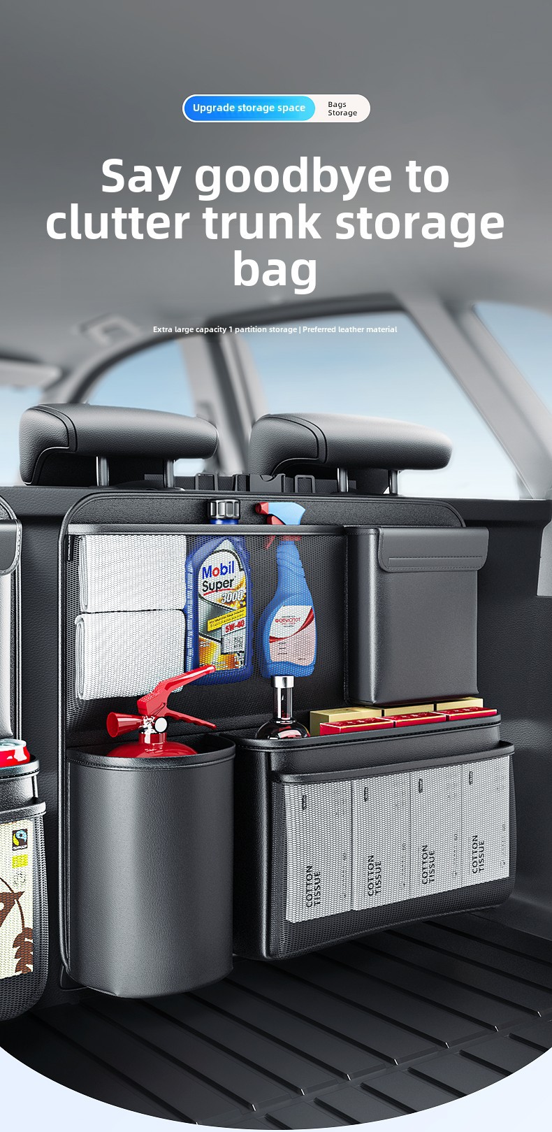 - Maximizes trunk floor space by utilizing the back of the rear seats for vertical storage and organization.
