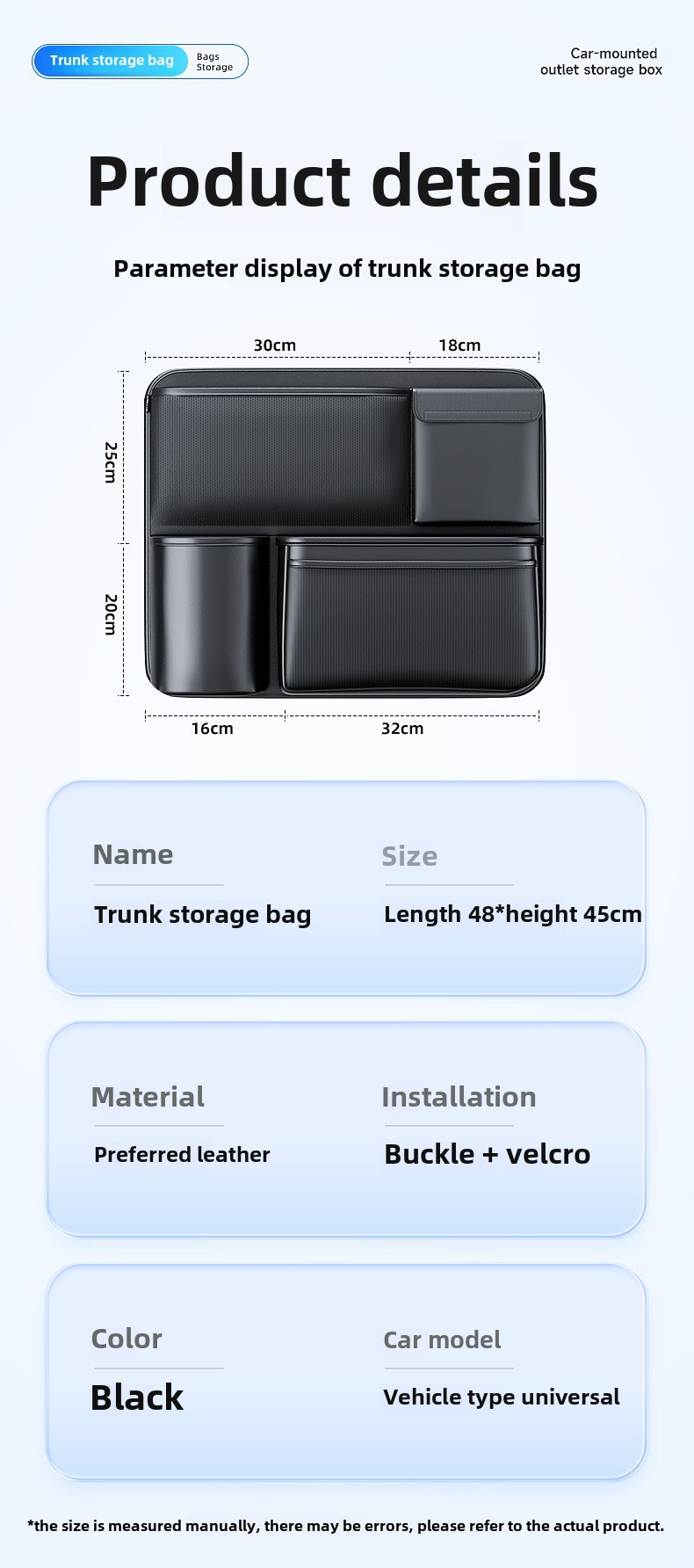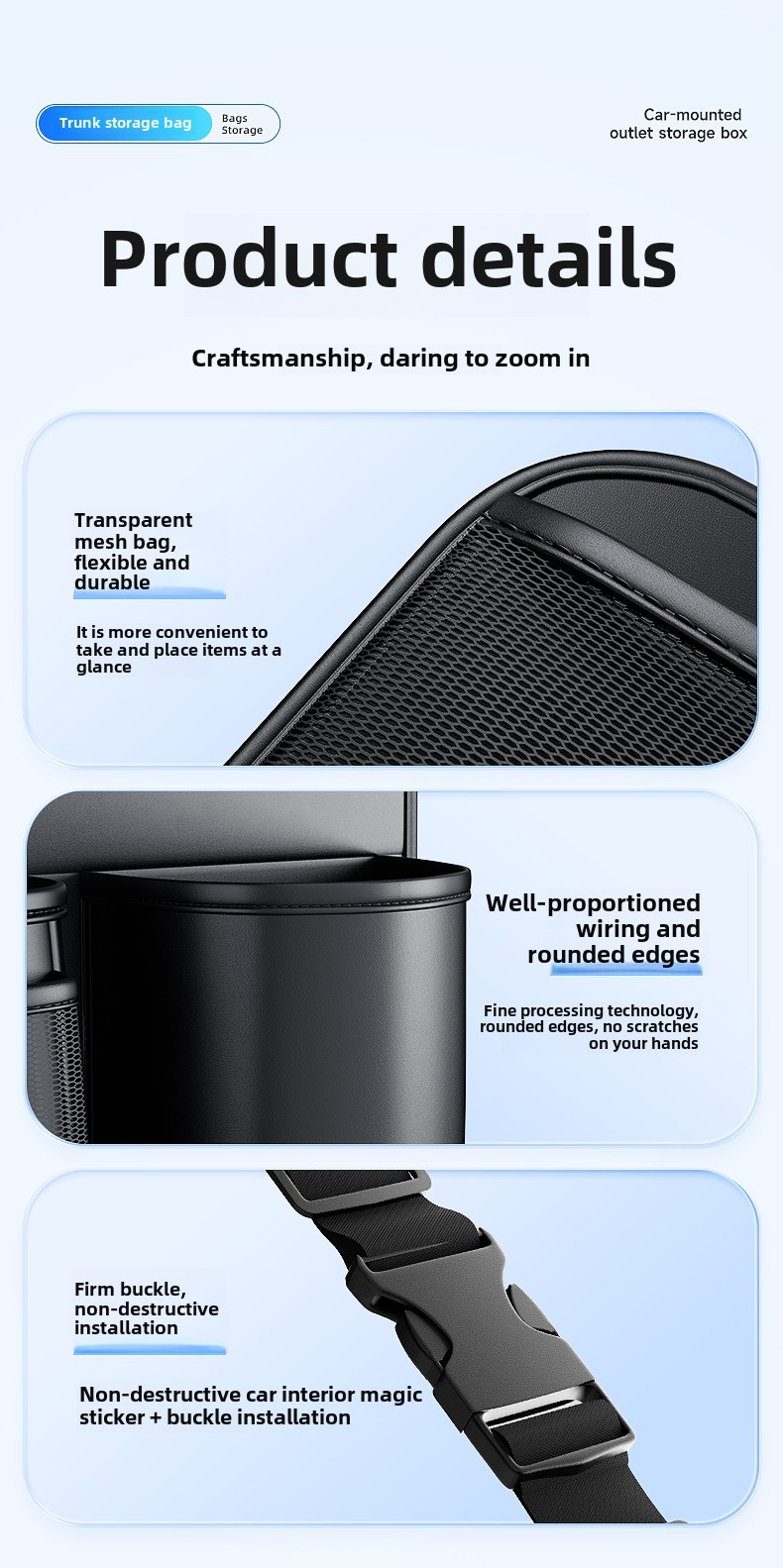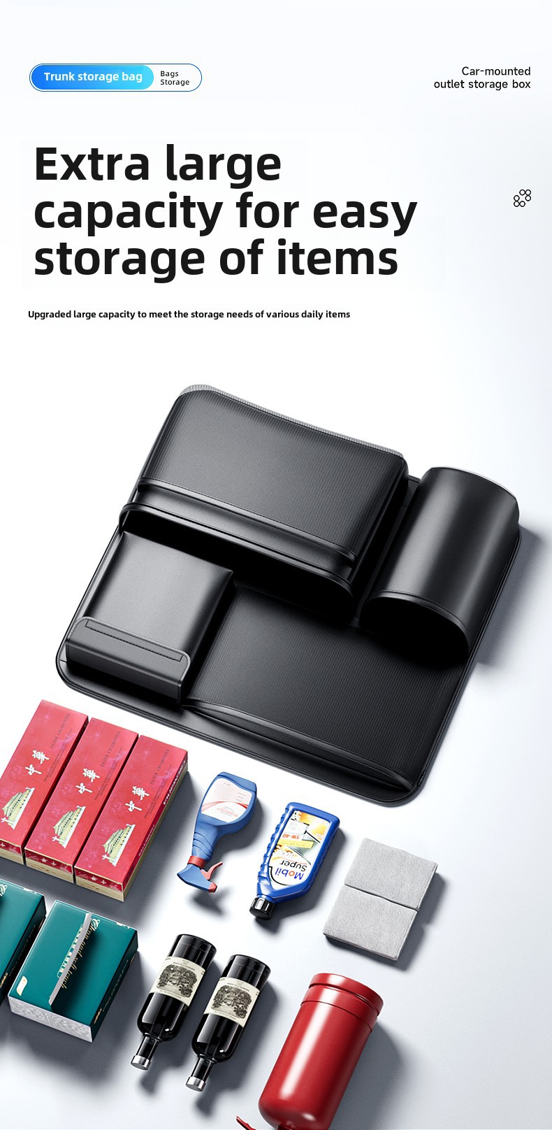 - Maximizes trunk floor space by utilizing the back of the rear seats for vertical storage and organization.