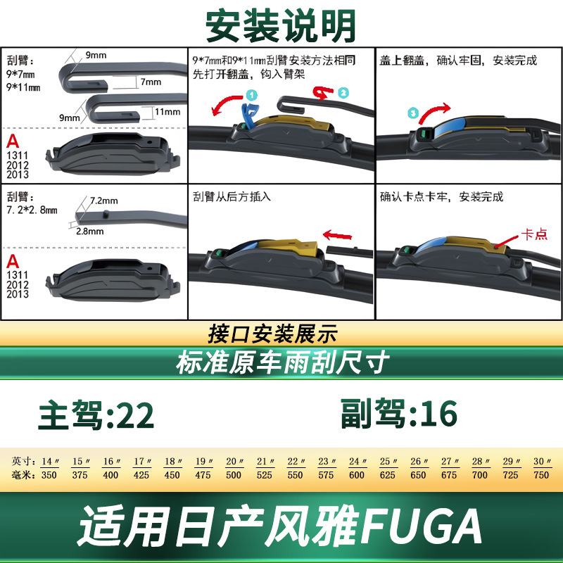 Upgrade your Nissan Fuga with these premium multi-functional frameless wiper blades. Featuring silent rubber technology for streak-free performance in all rains.