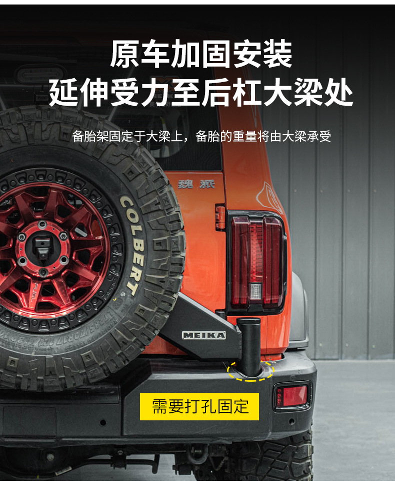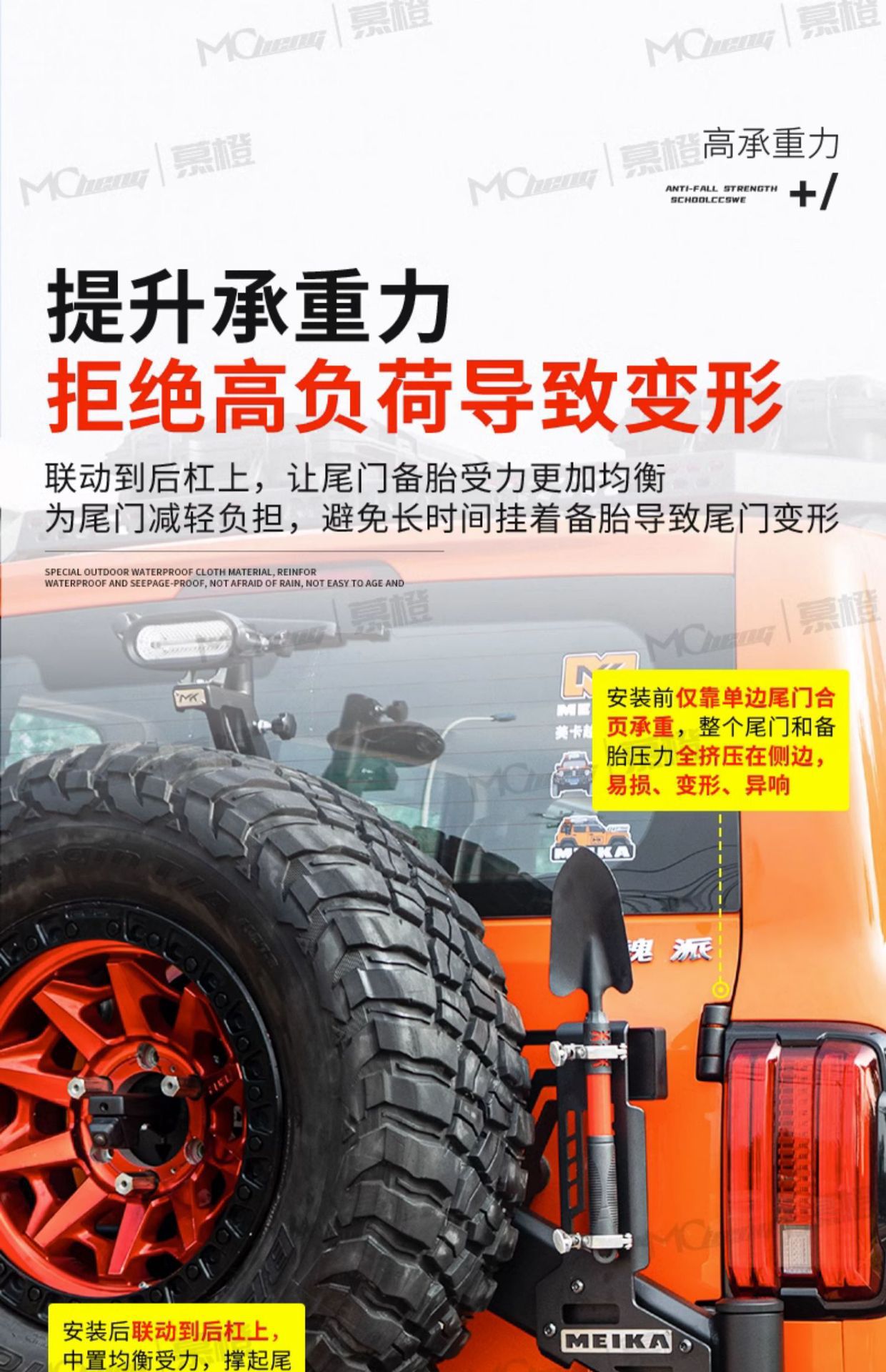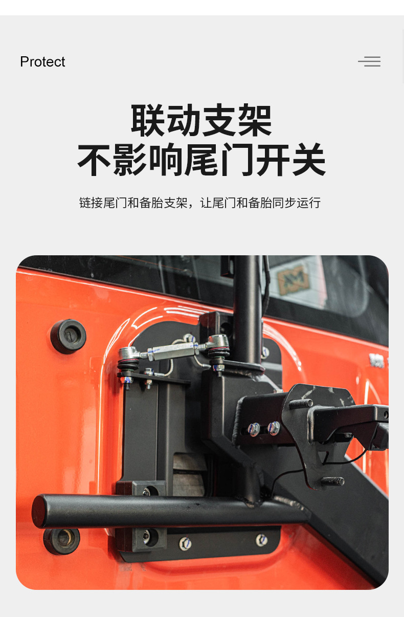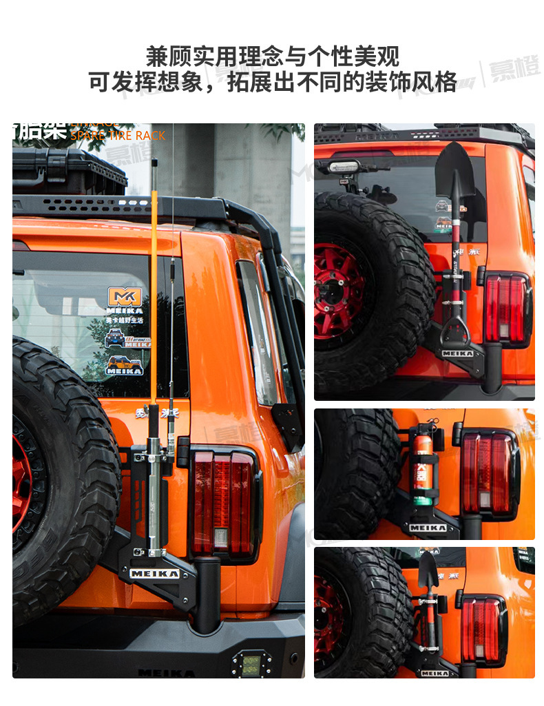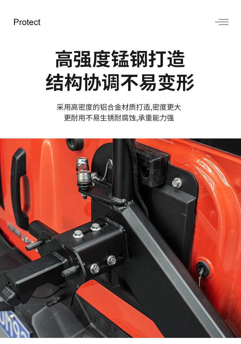 - Integrated multi-functional bracket combines spare tire support, license plate relocation, and auxiliary lighting mounts.