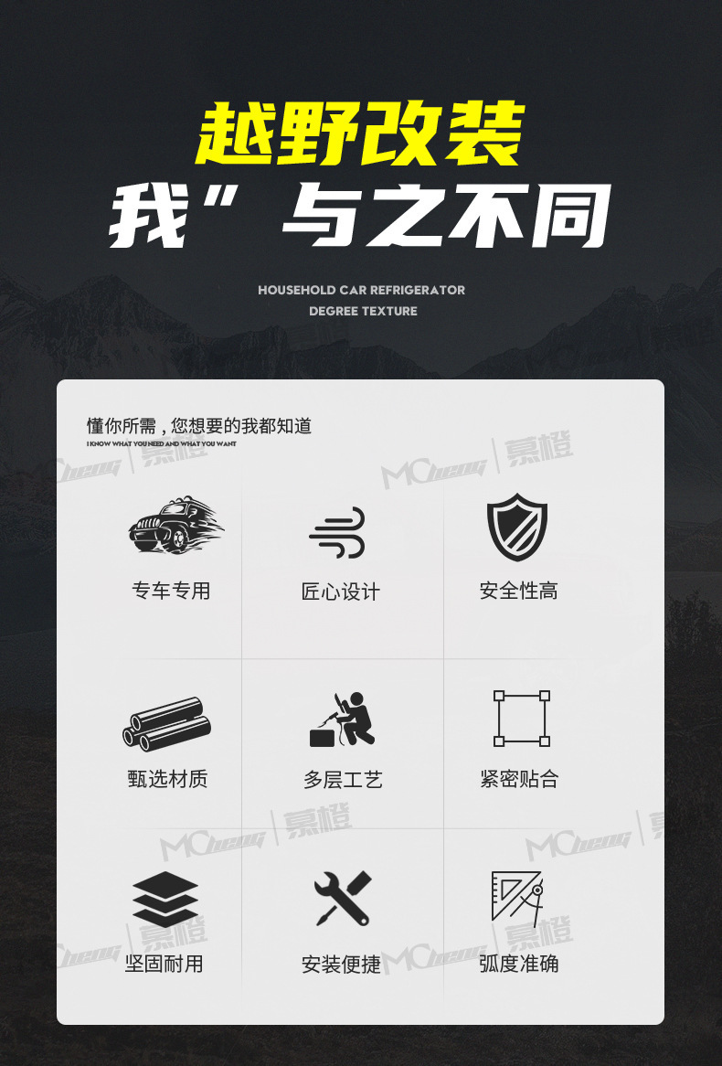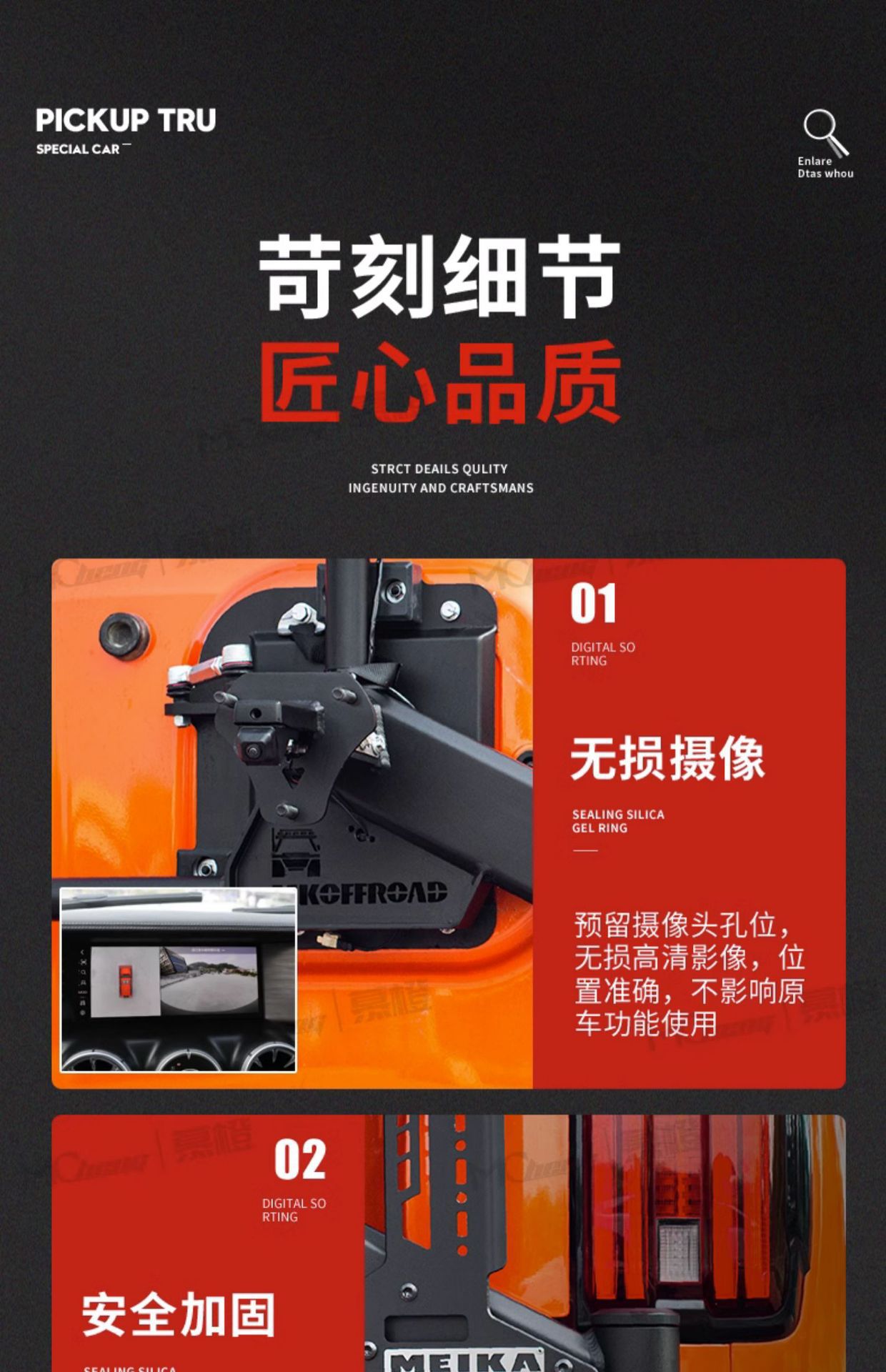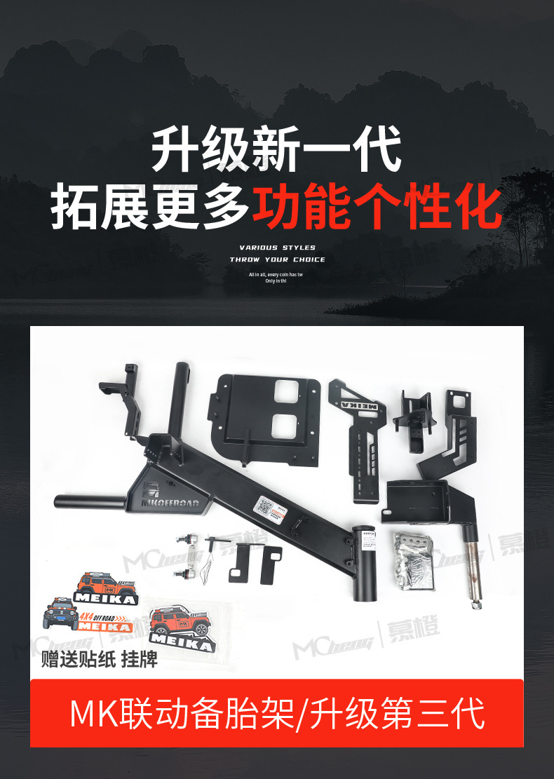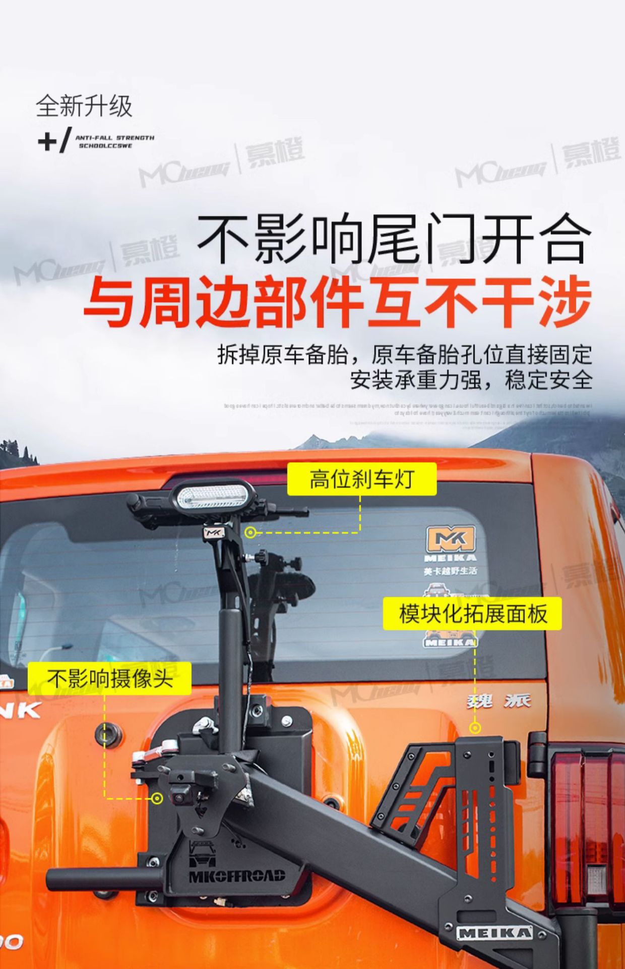 - Integrated multi-functional bracket combines spare tire support, license plate relocation, and auxiliary lighting mounts.