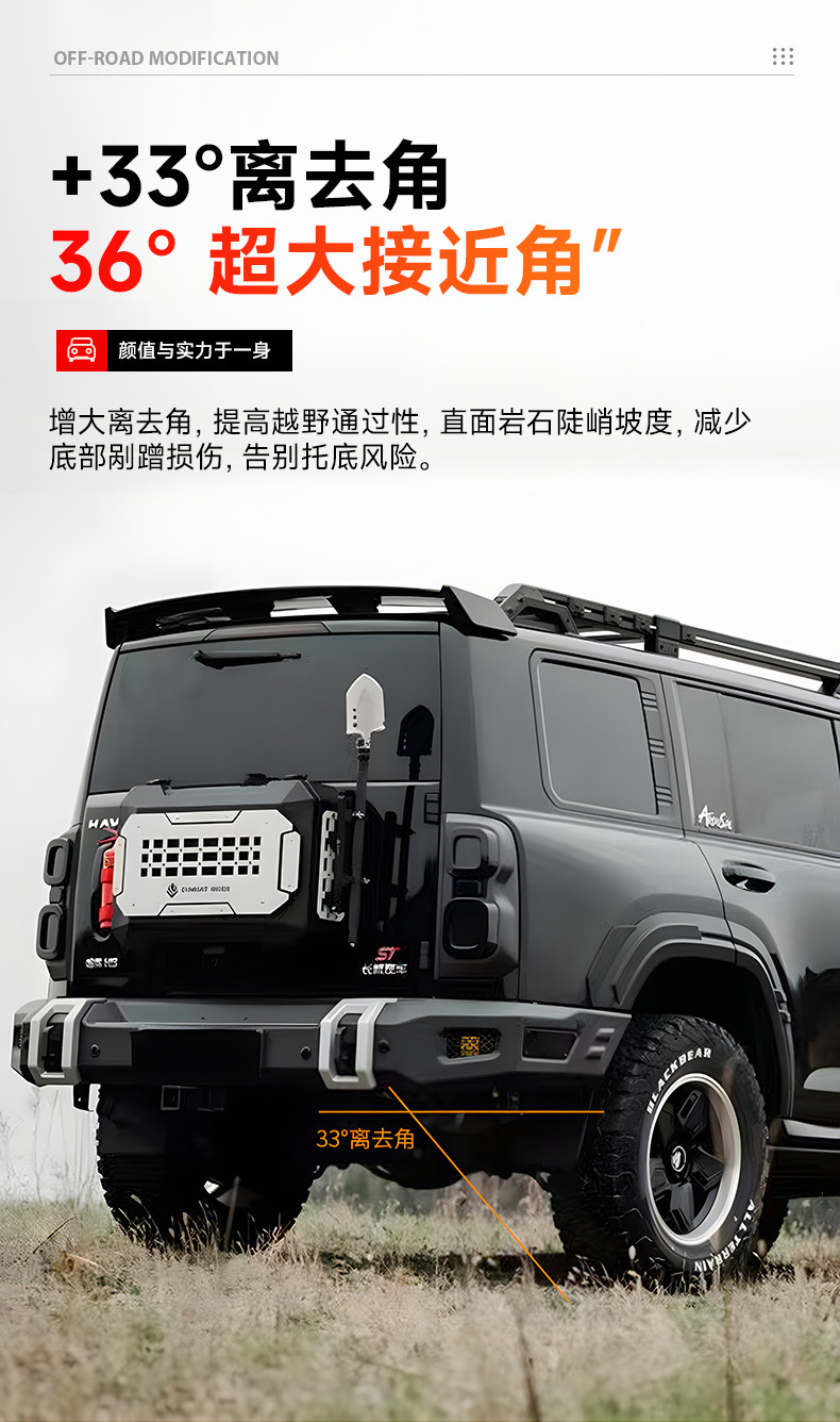 - Redesigned front grille and rear bumper assemblies improve approach and departure angles while providing a rugged armored appearance.