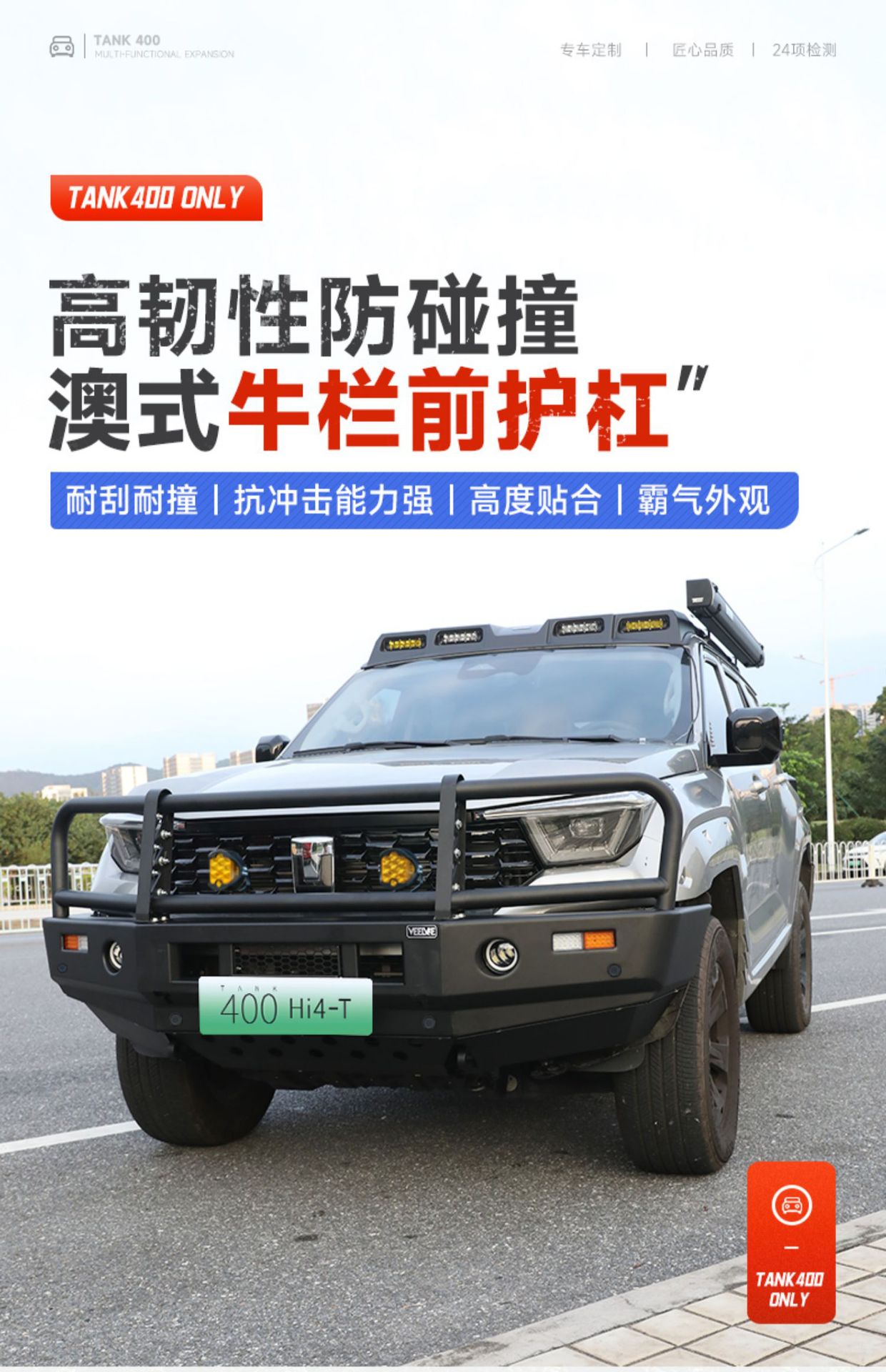 Upgrade your Tank 400 Hi4-T with this heavy-duty manganese steel bull bar kit. Provides ultimate front and rear protection for off-road racing and rugged trails.