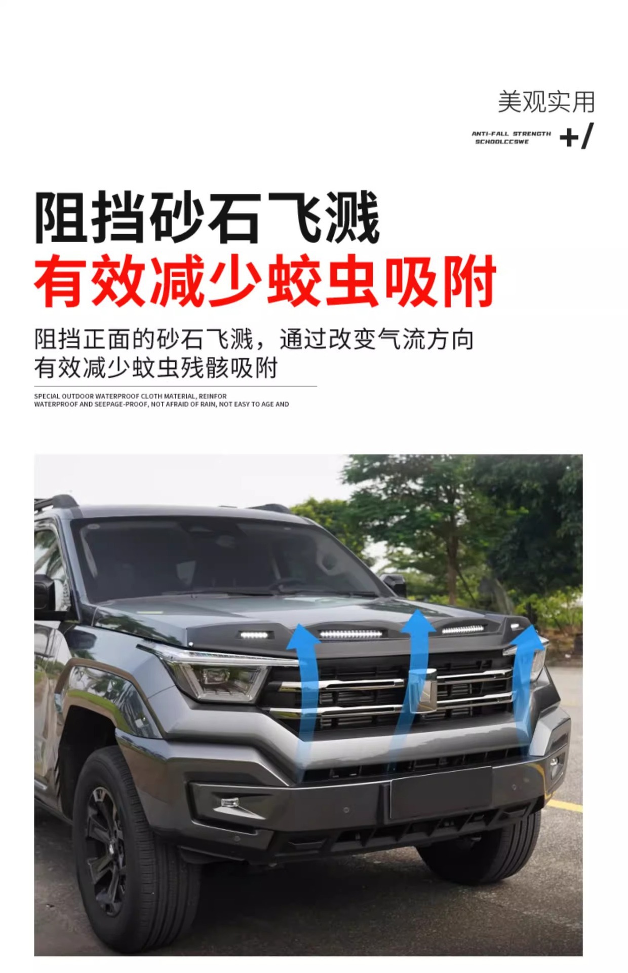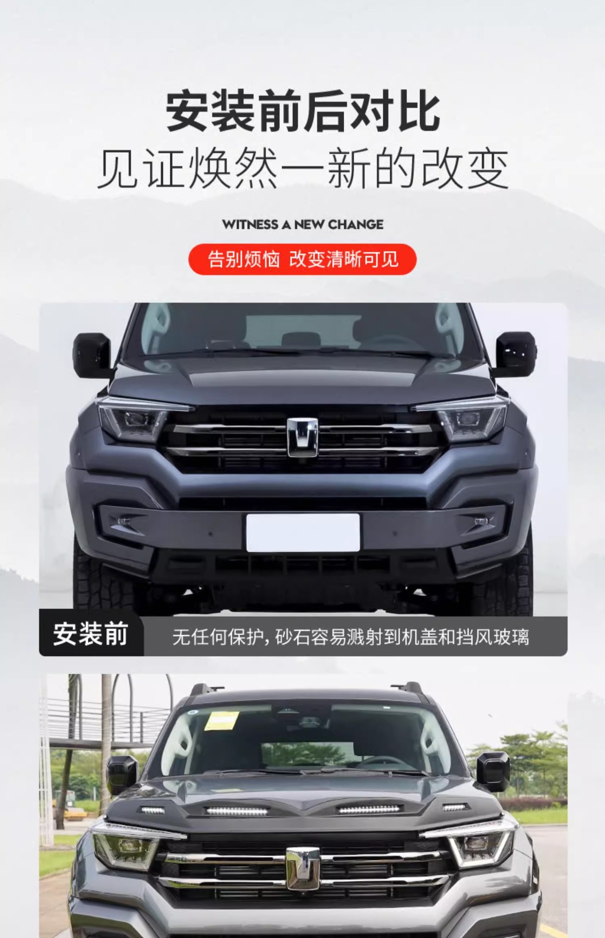 - Engine Hood Protection: Effectively shields the hood and windshield from sand, stones, and road debris during high-speed or off-road driving.