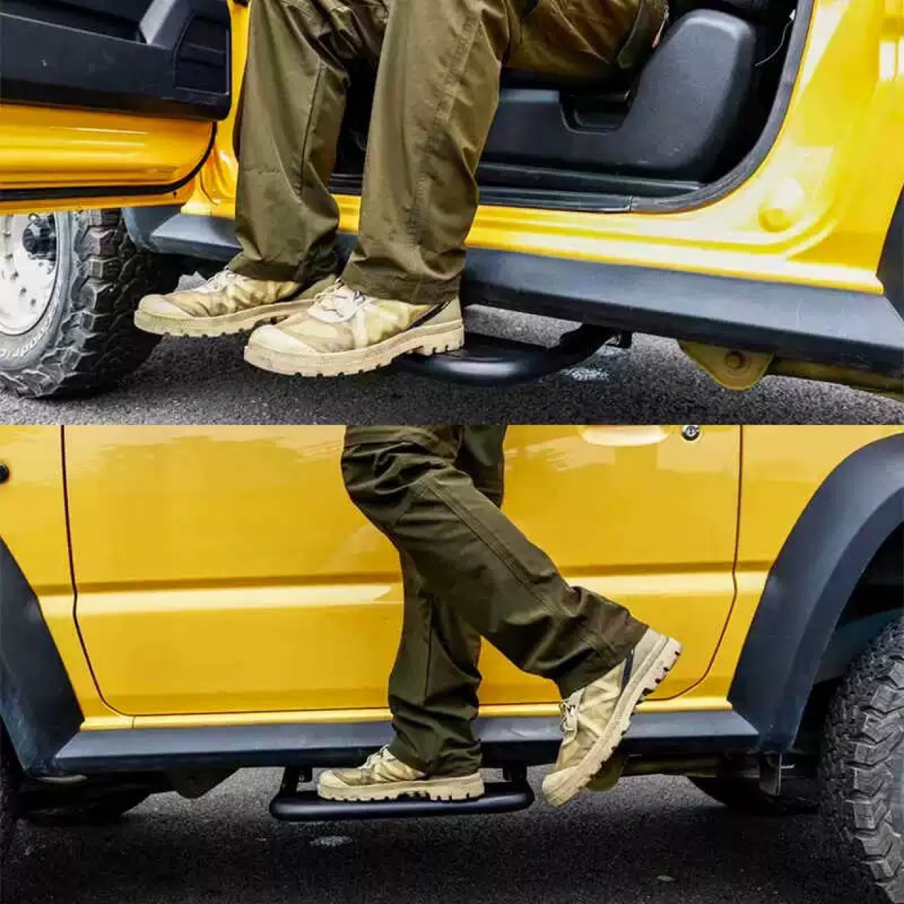 A: These steps are engineered specifically for the JB74 chassis. They are tucked close to the rocker panels to provide maximum clearance for oversized tires and suspension lifts common on modified Jimnys.