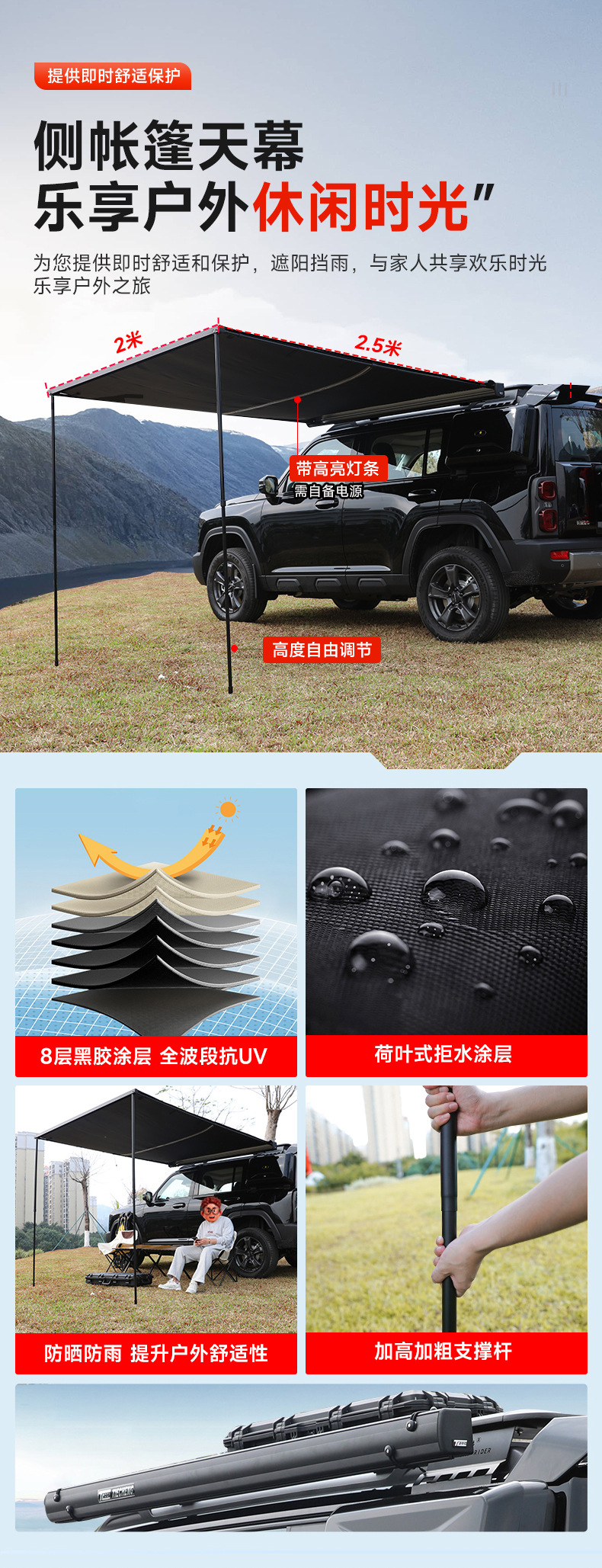 - Modular Compatibility: Includes pre-drilled mounting points for easy installation of spotlights, side tents, and additional recovery tools.