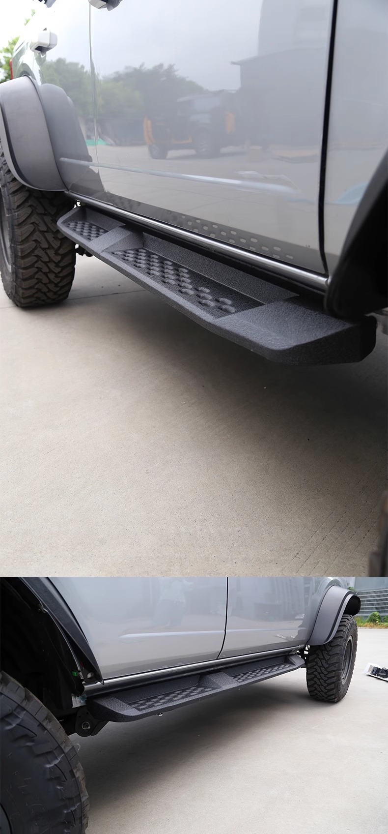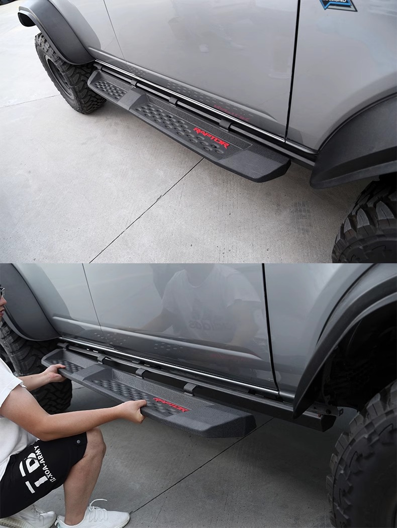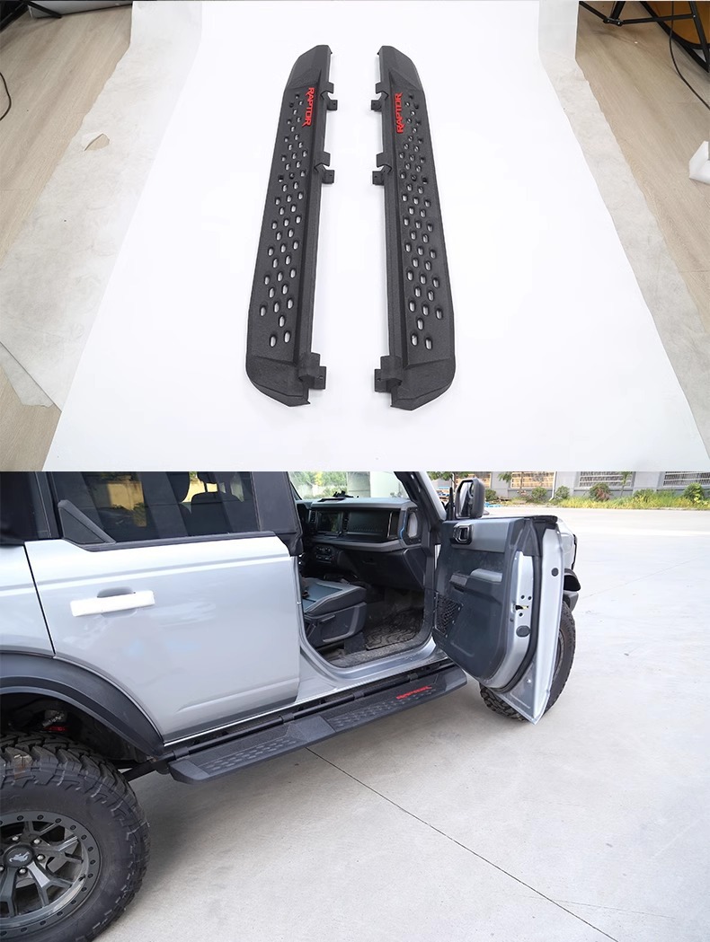 Upgrade your off-road experience with Raptor-style side steps for Ford Bronco. These durable running boards offer superior protection and easier vehicle access.