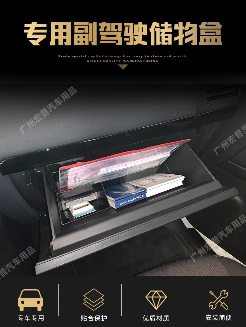 Tags: car interior tidy, console insert, dashboard divider, glove box organizer, passenger side tray, Prado interior accessories, secondary storage box
