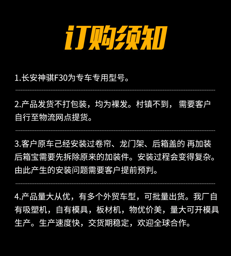 Protect your Changan Shenqi F30 pickup bed with this durable, anti-skid cargo liner. Designed for heavy-duty protection against impacts, scratches, and spills.