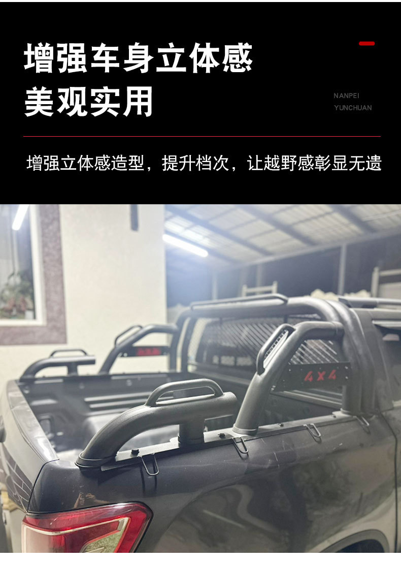- Multifunctional sports bar serves as both a protective roll cage and a versatile cargo tie-down rack.