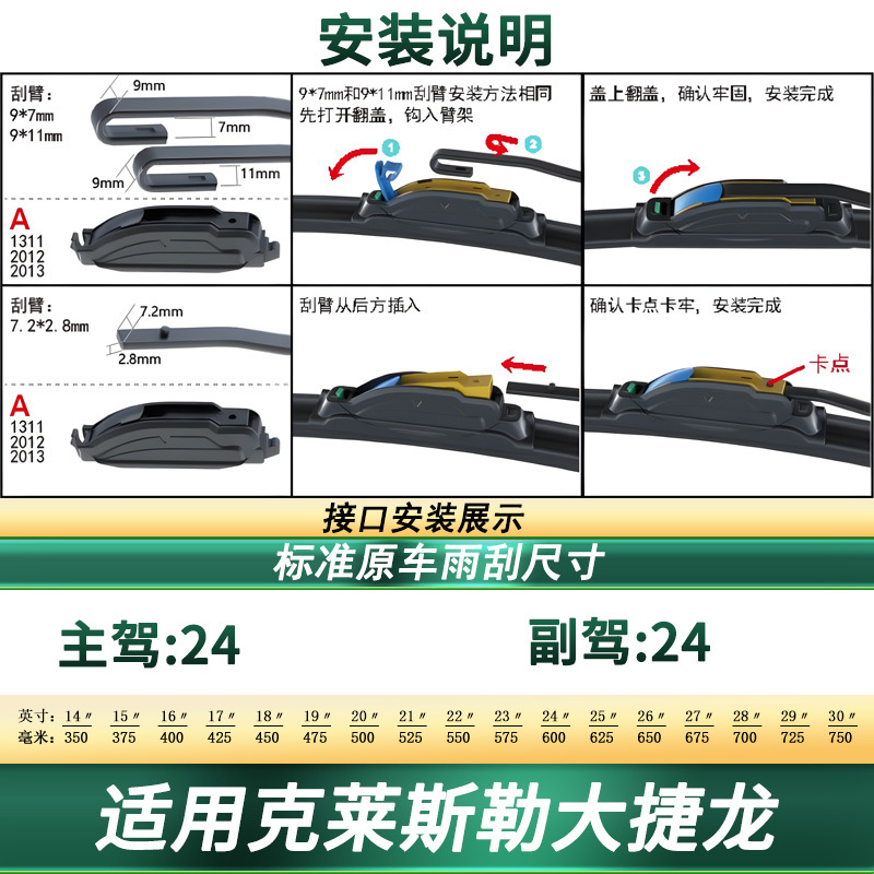 Professional Frameless Windshield Wiper Blades with Natural Rubber Strips for Chrysler Town & Country
