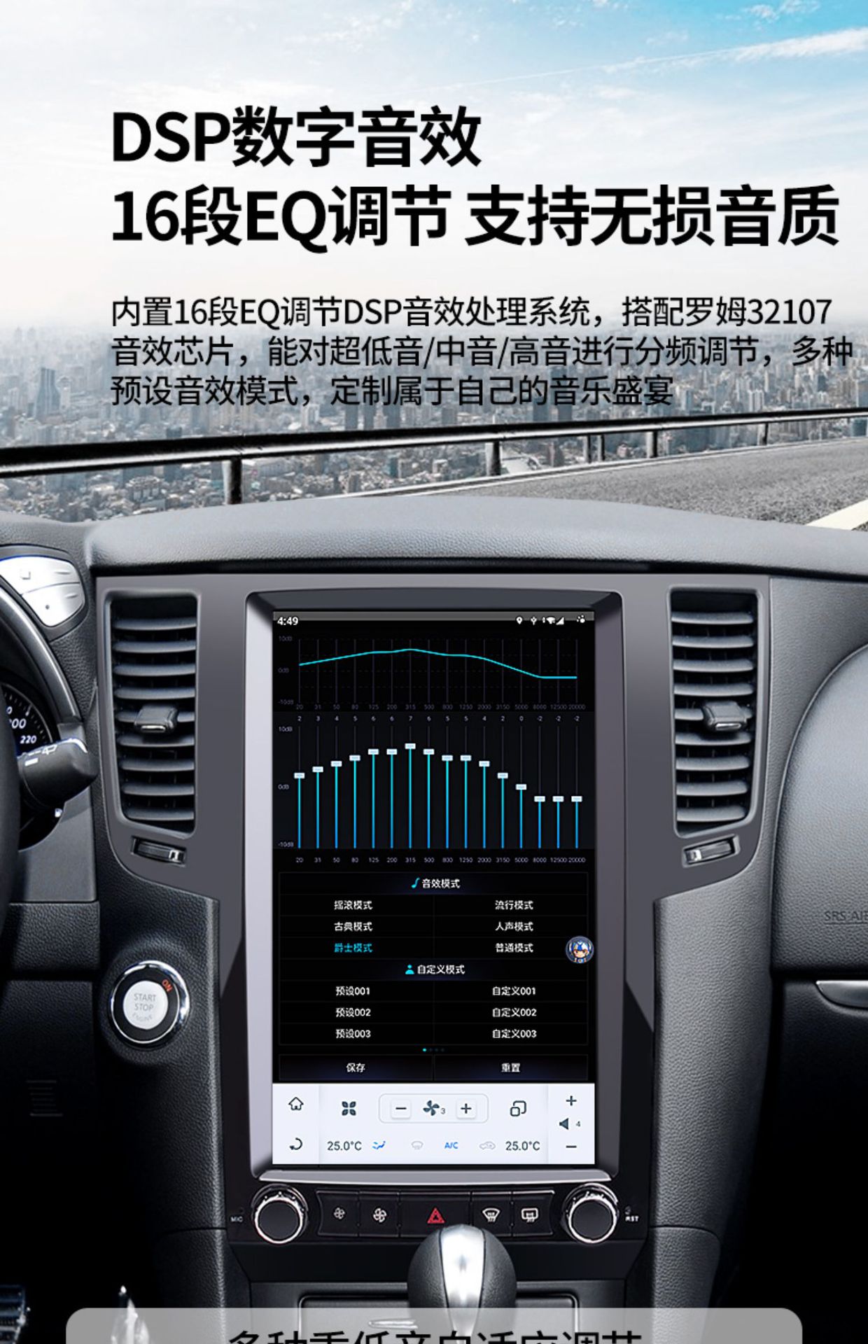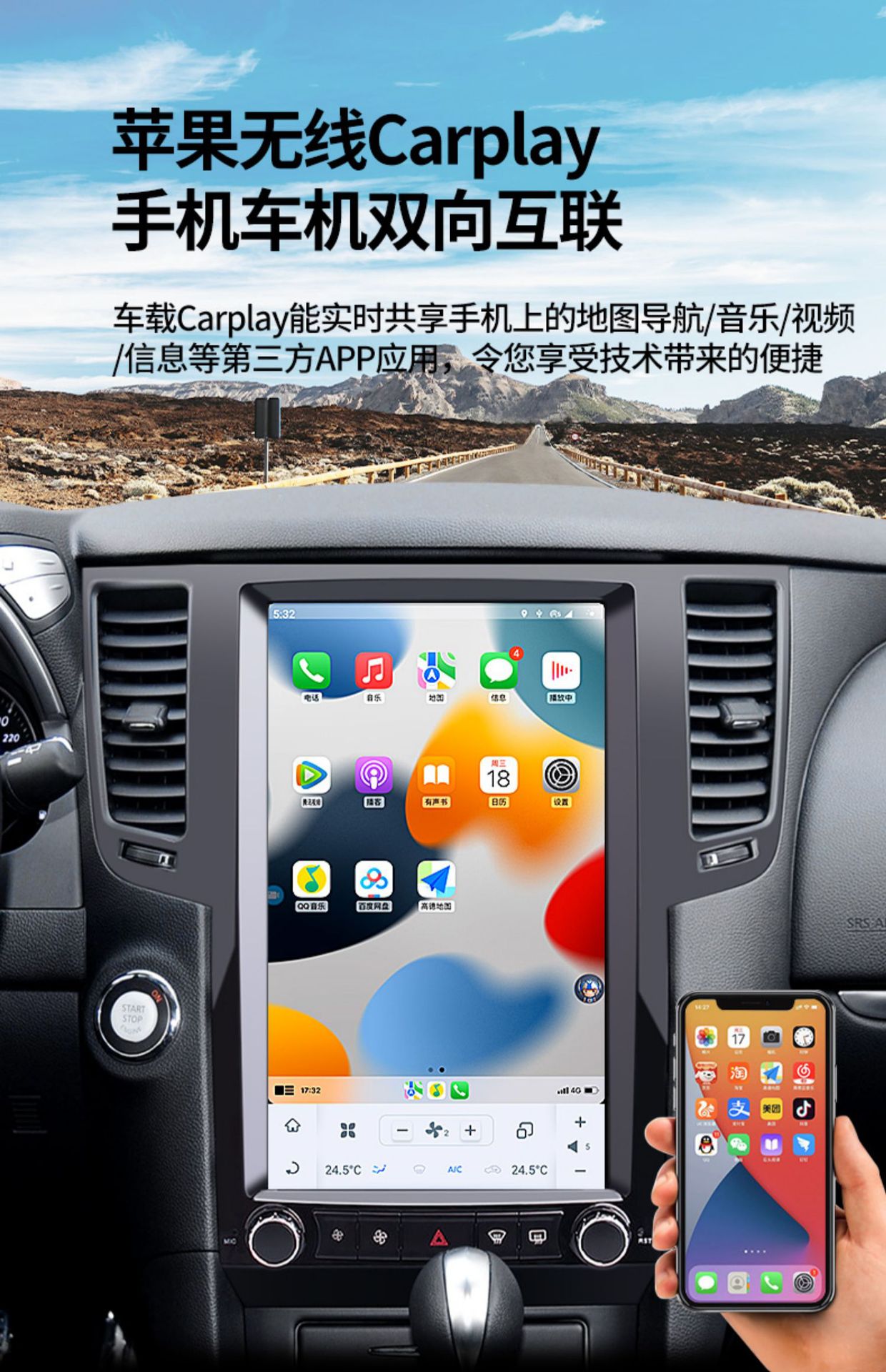 - Integrated Tesla-style vertical screen design provides a modern aesthetic and enhanced visibility for maps and media playback.