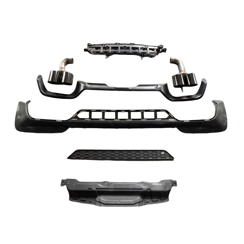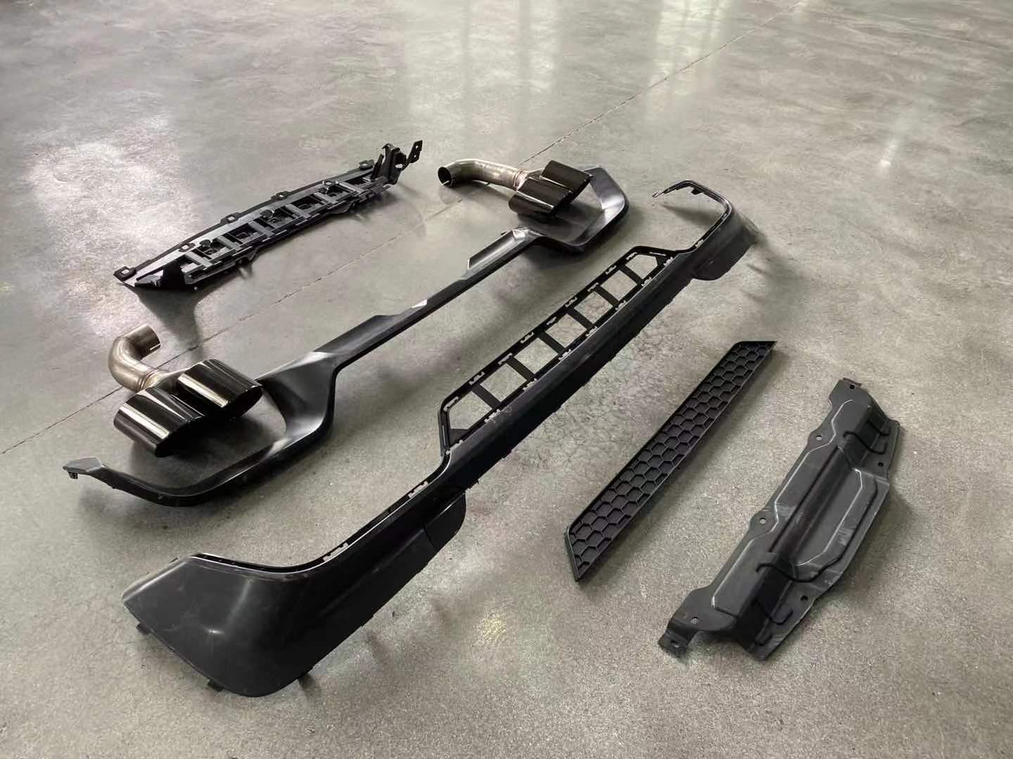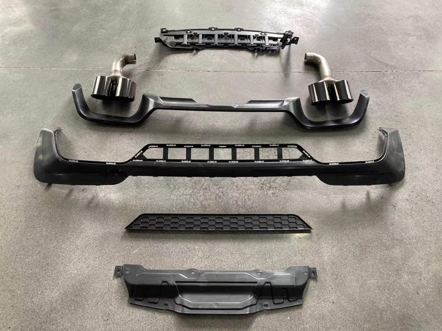 - Complete conversion kit includes both the rear bumper lower lip and the quad-exit exhaust tips.