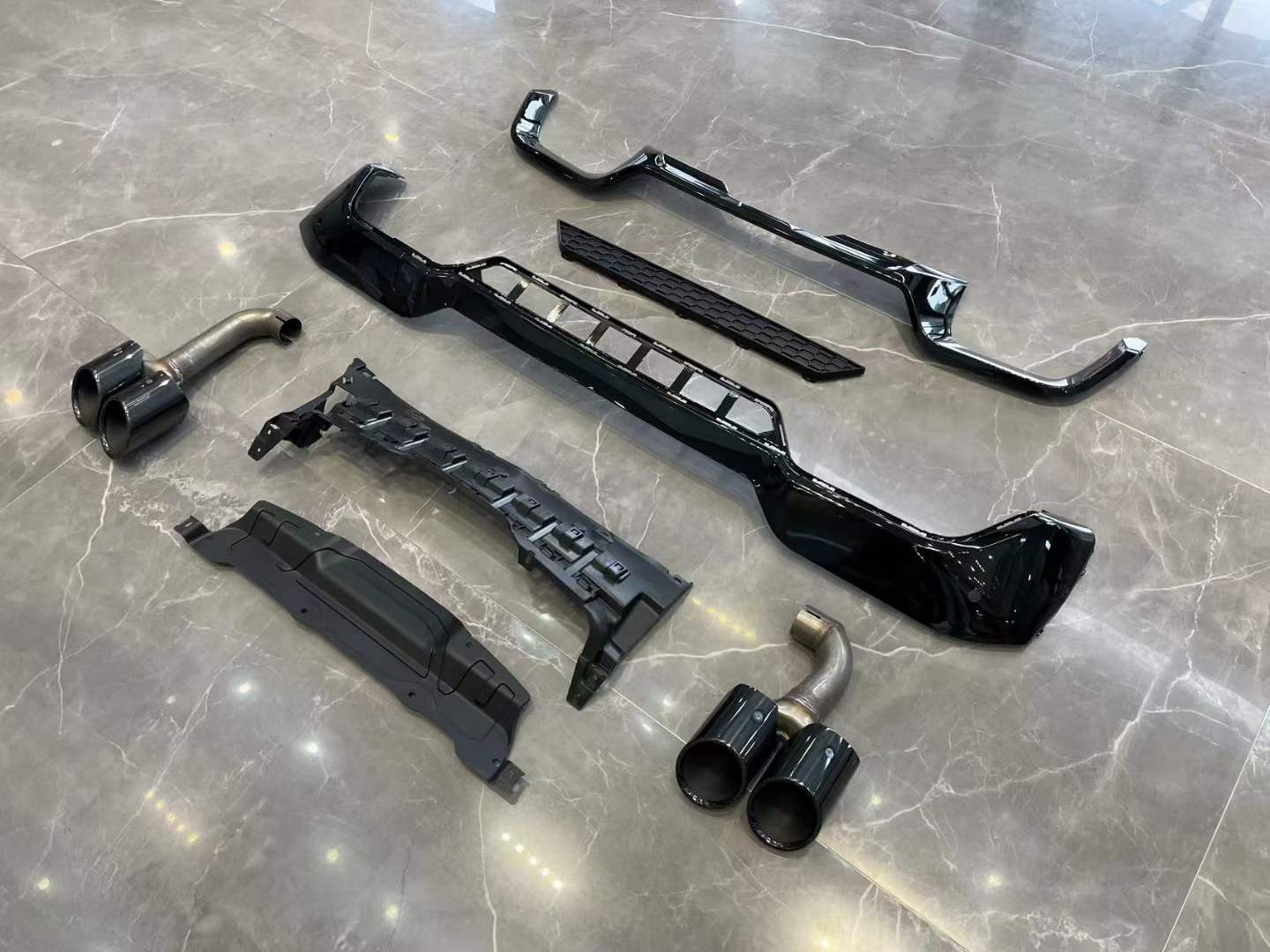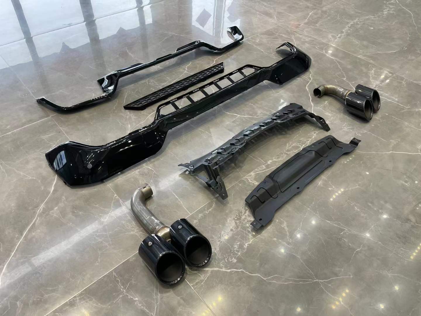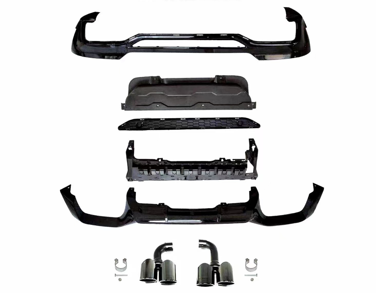 - Complete conversion kit includes both the rear bumper lower lip and the quad-exit exhaust tips.