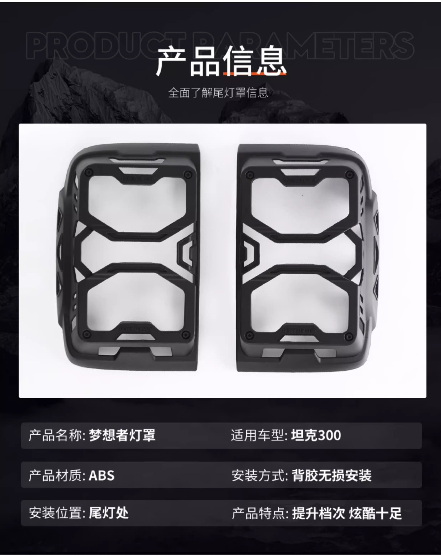 Enhance your Tank 300 with these premium rear tail light decorative frames. Durable ABS construction provides an off-road aesthetic and basic edge protection.
