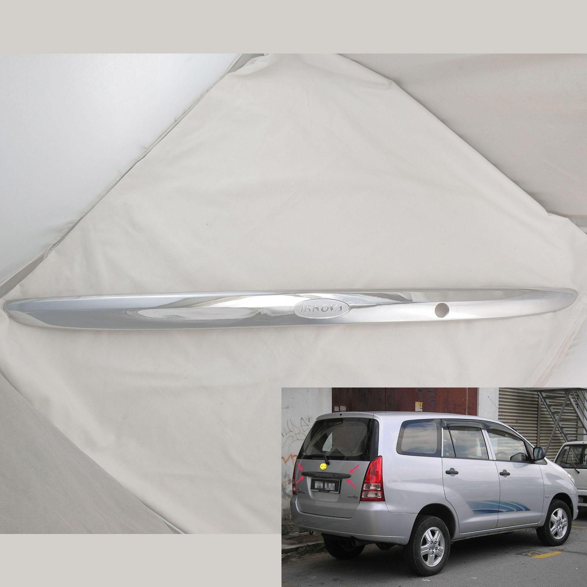 Enhance your Toyota Innova or Kijang 2004-2011 with this premium chrome rear tailgate garnish. Durable ABS material provides a mirror finish and scratch protection.